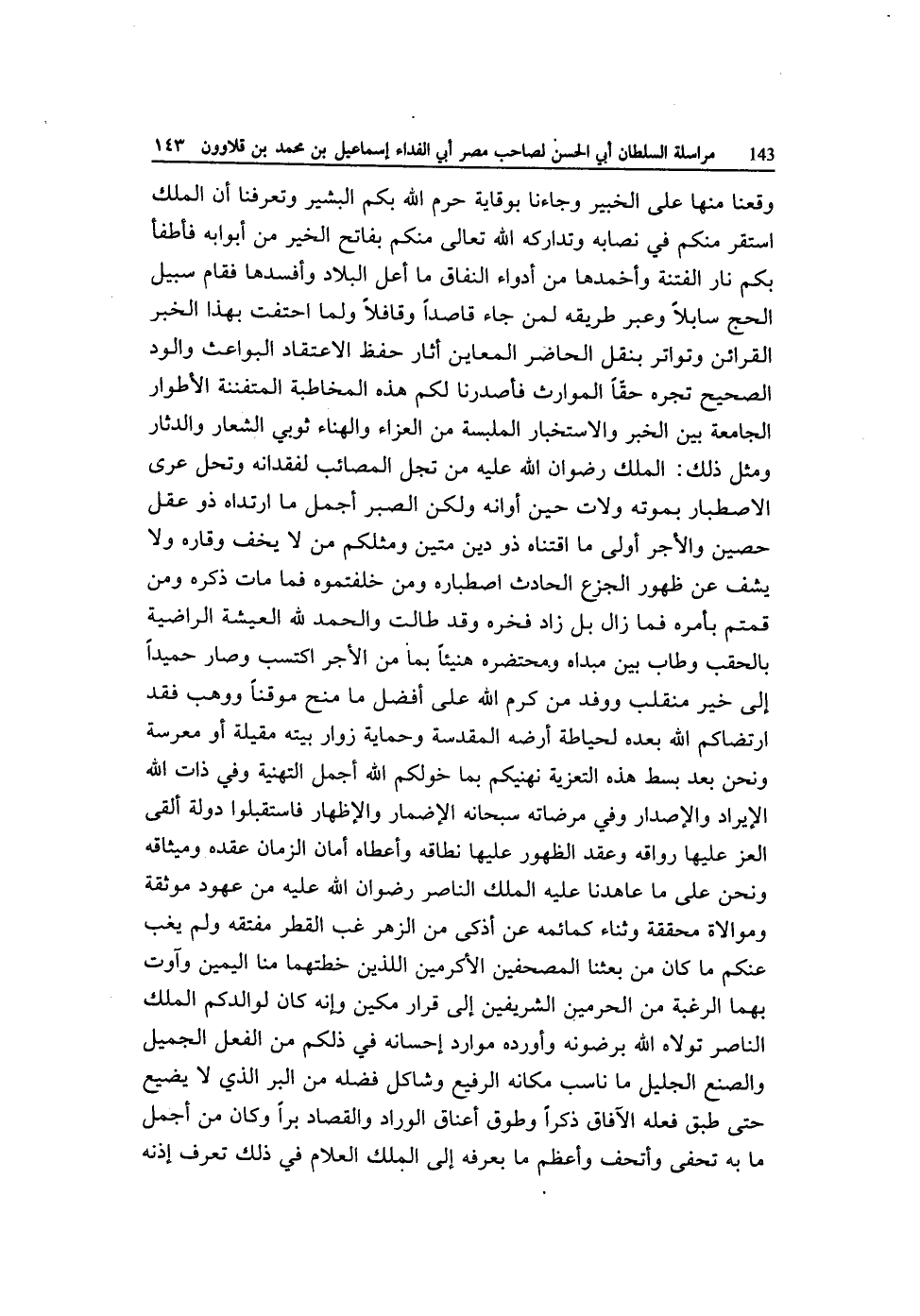 وقعنا مِنْهَا على الْخَبِير وجاءنا بوقاية حرم الله بكم البشير وتعرفنا أَن الْملك اسْتَقر مِنْكُم فِي نصابه وتداركه الله تَعَالَى مِنْكُم بفاتح الْخَيْر من أبوابه فأطفأ بكم نَار الْفِتْنَة وأخمدها مِنْهُ أدواء النِّفَاق مَا أعل الْبِلَاد وأفسدها فَقَامَ سَبِيل الْحَج سابلا وَعبر طَرِيقه لمن جَاءَ قَاصِدا وقافلا وَلما احتفت بِهَذَا الْخَبَر الْقَرَائِن وتواتر بِنَقْل الْحَاضِر المعاين أثار حفظ الإعتقاد البواعث والود الصَّحِيح تجره حَقًا الموارث فأصدرنا لكم هَذِه المخاطبة المتفننة الأطوار الجامعة بَين الْخَبَر والإستخبار الملبسة من العزاء والهناء ثوبي الشعار والدثار وَمثل ذَلِك الْملك رضوَان الله عَلَيْهِ من تجل المصائب لفقدانه وَتحل عرى الإصطبار بِمَوْتِهِ ولات حِين أَوَانه وَلَكِن الصَّبْر اجمل مَا ارتداه ذُو عقل حُصَيْن وَالْأَجْر أولى مَا اقتناه ذُو دين متين ومثلكم من لَا يخف وقاره وَلَا يشف عَن ظُهُور الْجزع الْحَادِث اصطباره وَمن خلفتموه فَمَا مَاتَ ذكره وَمن قُمْتُم بأَمْره فَمَا زَالَ بل زَاد فخره وَقد طَالَتْ وَالْحَمْد لله العيشه الراضية بالحقب وطاب بَين مبداه ومحتضره هَنِيئًا بِمَا من الْأجر اكْتسب وَصَارَ حميدا إِلَى خير مُنْقَلب ووفد من كرم الله على أفضل مَا منح موقنا ووهب فقد ارتضاكم الله بعده لحياطة أرضه المقدسة وحماية زوار بَيته مقيلة أَو معرسة وَنحن بعد بسط هَذِه التَّعْزِيَة نهنيكم بِمَا خولكم الله أجمل التهنية وَفِي ذَات الله الْإِيرَاد والإصدار وَفِي مرضاته سُبْحَانَهُ الْإِضْمَار والإظهار فَاسْتَقْبلُوا دولة ألْقى الْعِزّ عَلَيْهَا رواقه وَعقد الظُّهُور عَلَيْهَا نطاقه وَأَعْطَاهُ أَمَان الزَّمَان عقده وميثاقه وَنحن على مَا عاهدنا عَلَيْهِ الْملك النَّاصِر رضوَان الله عَلَيْهِ من عهود موثقة وموالاة مُحَققَة وثناء كمائمه عَن أذكى من الزهر غب الْقطر مفتقه وَلم يغب عَنْكُم مَا كَانَ من بعثنَا المصحفين الأكرمين اللَّذين خطتهما منا الْيَمين وآوت بهما الرَّغْبَة من الْحَرَمَيْنِ الشريفين إِلَى قَرَار مكين وَإنَّهُ كَانَ لوالدكم الْملك النَّاصِر تولاة الله برضونه وَأوردهُ موارد إحسانه فِي ذَلِكُم من الْفِعْل الْجَمِيل والصنع الْجَلِيل مَا ناسب مَكَانَهُ الرفيع وشاكل فَضله من الْبر الَّذِي لَا يضيع حَتَّى طبق فعله الْآفَاق ذكرا وطوق أَعْنَاق الوراد والقصاد برا وَكَانَ من أجمل مَا بِهِ تحفى وأتحف وَأعظم مَا بعرفه إِلَى الْملك العلام فِي ذَلِك تعرف إِذْنه