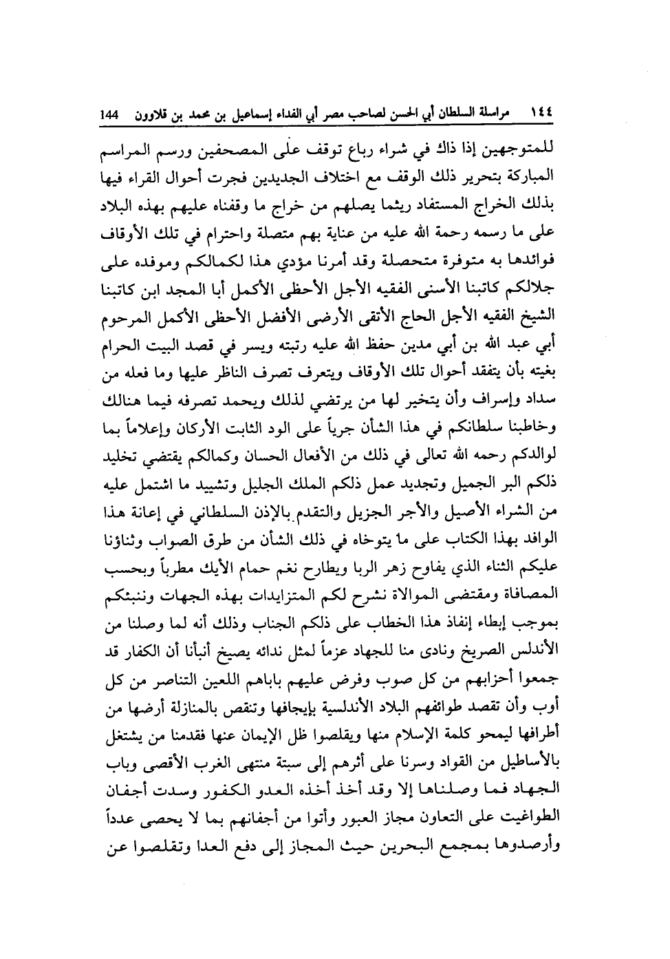 للمتوجهين إِذا ذَاك فِي شِرَاء رباع توقف على المصحفين ورسم المراسم الْمُبَارَكَة بتحرير ذَلِك الْوَقْف مَعَ اخْتِلَاف الجديدين فجرت أَحْوَال الْقُرَّاء فِيهَا بذلك الْخراج السمتفاد ريثما يصلهم من خراج مَا وقفناه عَلَيْهِم بِهَذِهِ الْبِلَاد على مَا رسمه رَحْمَة الله عَلَيْهِ من عناية بِهِ مُتَّصِلَة واحترام فِي تِلْكَ الْأَوْقَاف فوائدها بِهِ متوفرة متحصلة وَقد أمرنَا مؤدي هَذَا لَكمَا لكم وموفده على جلالكم كاتبنا الْأَسْنَى الْفَقِيه الْأَجَل الأحظى الْأَكْمَل أَبَا الْمجد ابْن كاتبنا الشَّيْخ الْفَقِيه الْأَجَل الْحَاج الأتقى الأرضى الْأَفْضَل الأحظى الْأَكْمَل المرحوم أبي عبد الله بن أبي مَدين حفظ الله عَلَيْهِ رتبته وَيسر فِي قصد الْبَيْت الْحَرَام بغيته بِأَن يتفقد أَحْوَال تِلْكَ الْأَوْقَاف ويتعرف تصرف النَّاظر عَلَيْهَا وَمَا فعله من سداد وإسراف وَأَن يتَخَيَّر لَهَا من يرتضي لذَلِك ويحمد تصرفه فِيمَا هُنَالك وخاطبنا سلطانكم فِي هَذَا الشَّأْن جَريا على الود الثَّابِت الْأَركان وإعلاما بِمَا لوالدكم رَحمَه الله تَعَالَى فِي ذَلِك من الْأَفْعَال الحسان وكما لكم يَقْتَضِي تخليد ذَلِكُم الْبر الْجَمِيل وتجديد علم ذَلِك الْملك الْجَلِيل وتشييد مَا اشْتَمَل عَلَيْهِ من الشِّرَاء الْأَصِيل وَالْأَجْر الجزيل والتقدم بِالْإِذْنِ السلطاني فِي إِعَانَة هَذَا الْوَافِد بِهَذَا الْكتاب على مَا يتوخاه فِي ذَلِك الشَّأْن من طرق الصَّوَاب وثناؤنا عَلَيْكُم الثَّنَاء الَّذِي يفاوح زهر الرِّبَا ويطارح نغم حمام الأيك مطربا وبحسب المصافاة وَمُقْتَضى الْمُوَالَاة نشرح لكم المتزايدات بِهَذِهِ الْجِهَات وننبئكم بِمُوجب إبطاء إِنْفَاذ هَذَا الْخطاب على ذَلِكُم الجناب وَذَلِكَ أَنه لما وصلنا من الأندلس الصَّرِيخ ونادى منا للْجِهَاد عزما لمثل ندائه يصيخ أَنبأَنَا أَن الْكفَّار قد جمعُوا أحزابهم من كل صوب وَفرض عَلَيْهِم باباهم اللعين التناصر من كل أَوب وَأَن تقصد طوائفهم الْبِلَاد الأندلسية بإيجافها وتنقص بالمنازلة أرْضهَا من أطرافها ليمحو كلمة الْإِسْلَام مِنْهَا ويقلصوا ظلّ الْإِيمَان عَنْهَا فقدمنا من يشْتَغل بالأساطيل من القواد وسرنا على اثرهم إِلَى سبتة مُنْتَهى الغرب الْأَقْصَى وَبَاب الْجِهَاد فَمَا وصلناها إِلَّا وَقد أَخذه الْعَدو الكفور وسدت أجفان الطواغيت على التعاون مجَاز العبور وَأتوا من أجفانهم بِمَا لَا يُحْصى عددا وأرصدوها بمجمع الْبَحْرين حَيْثُ الْمجَاز إِلَى دفع العدا وتقلصوا عَن