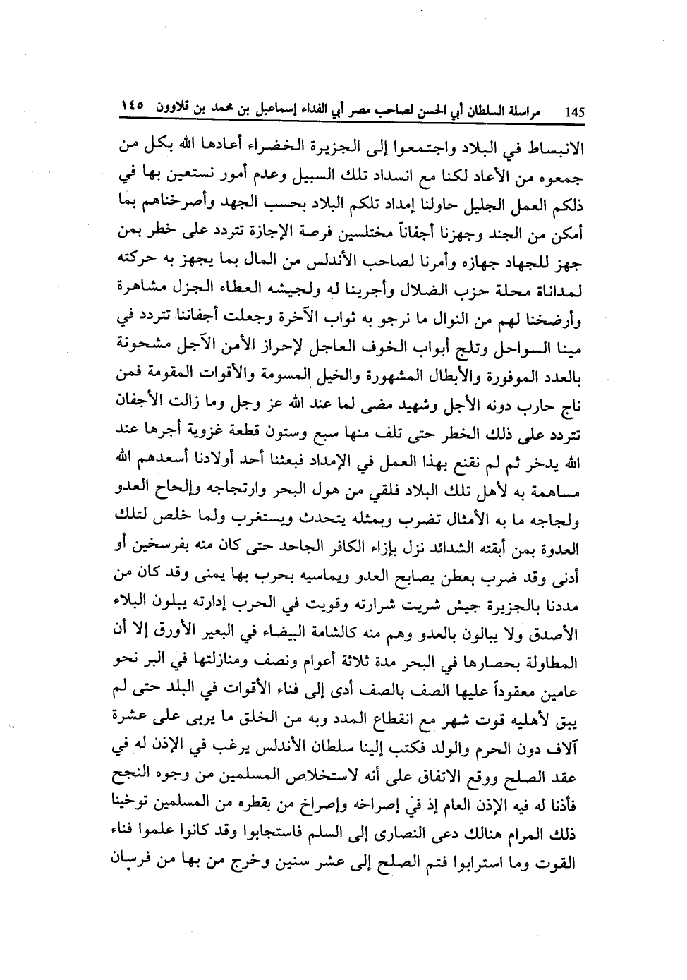الانبساط فِي الْبِلَاد واجتمعوا إِلَى الجزيرة الخضراء أَعَادَهَا الله بِكُل من جَمَعُوهُ من الأعاد لَكنا مَعَ انسداد تِلْكَ السَّبِيل وَعدم أُمُور نستعين بهَا فِي ذَلِكُم الْعَمَل الْجَلِيل حاولنا إمداد تلكم الْبِلَاد بِحَسب الْجهد وأصرخناهم بِمَا أمكن من الْجند وجهزنا أجفانا مختلسين فرْصَة الْإِجَازَة تَتَرَدَّد على خطر بِمن جهز للْجِهَاد جهازه وأمرنا لصَاحب الأندلس من المَال بِمَا يُجهز بِهِ حركته لمداناة محلّة حزب الضلال وأجرينا لَهُ ولجيشه الْعَطاء الجزل مشاهرة وأرضخنا لَهُم من النوال مَا نرجو بِهِ ثَوَاب الْآخِرَة وَجعلت أجفاننا تَتَرَدَّد فِي مينا السواحل وتلج أَبْوَاب الْخَوْف العاجل لإحراز الْأَمْن الآجل مشحونة بِالْعدَدِ الموفورة والأبطال الْمَشْهُورَة وَالْخَيْل المسومة والأقوات المقومة فَمن نَاجٍ حَارب دونه الْأَجَل وشهيد مضى لما عِنْد الله عز وَجل وَمَا زَالَت الأجفان تَتَرَدَّد على ذَلِك الْخطر حَتَّى تلف مِنْهَا سبع وَسِتُّونَ قِطْعَة غزوية أجرهَا عِنْد الله يدّخر ثمَّ لم نقنع بِهَذَا الْعَمَل فِي الْإِمْدَاد فَبَعَثنَا أحد أَوْلَادنَا أسعدهم الله مساهمة بِهِ لأهل تِلْكَ الْبِلَاد فلقي من هول الْبَحْر وارتجاجه وإلحاح الْعَدو ولجاجه مَا بِهِ الْأَمْثَال تضرب وبمثله يتحدث ويستغرب وَلما خلص لتِلْك العدوة بِمن أبقته الشدائد نزل بِإِزَاءِ الْكَافِر الجاحد حَتَّى كَانَ مِنْهُ بفرسخين أَو أدنى وَقد ضرب بِعَطَن يصابح الْعَدو ويماسيه بِحَرب بهَا يمنى وَقد كَانَ من مددنا بالجزيرة جَيش شريت شرارته وقويت فِي الْحَرْب إدارته يبلون الْبلَاء الأصدق وَلَا يبالون بالعدو وهم مِنْهُ كَالشَّامَةِ الْبَيْضَاء فِي الْبَعِير الأورق إِلَّا أَن المطاولة بحصارها فِي الْبَحْر مُدَّة ثَلَاثَة أَعْوَام وَنصف ومنازلتها فِي الْبر نَحْو عَاميْنِ معقودا عَلَيْهَا الصَّفّ بالصف أدّى إِلَى فنَاء الأقوات فِي الْبَلَد حَتَّى لم يبْق لأهليه قوت شهر مَعَ انْقِطَاع المدد وَبِه من الْخلق مَا يربى على عشرَة آلَاف دون الْحرم وَالْولد فَكتب إِلَيْنَا سُلْطَان الأندلس يرغب فِي الْأذن لَهُ فِي عقد الصُّلْح وَوَقع الِاتِّفَاق على أَنه لاستخلاص الْمُسلمين من وُجُوه النجع فأذنا لَهُ فِيهِ الْإِذْن الْعَام إِذْ فِي إصراخه وإصراخ من بقطره من الْمُسلمين توخينا ذَلِك المرام هُنَالك دَعَا النَّصَارَى إِلَى السّلم فاستجابوا وَقد كَانُوا علمُوا فنَاء الْقُوت وَمَا استرابوا فتم الصُّلْح إِلَى عشر سِنِين وَخرج من بهَا من فرسَان
