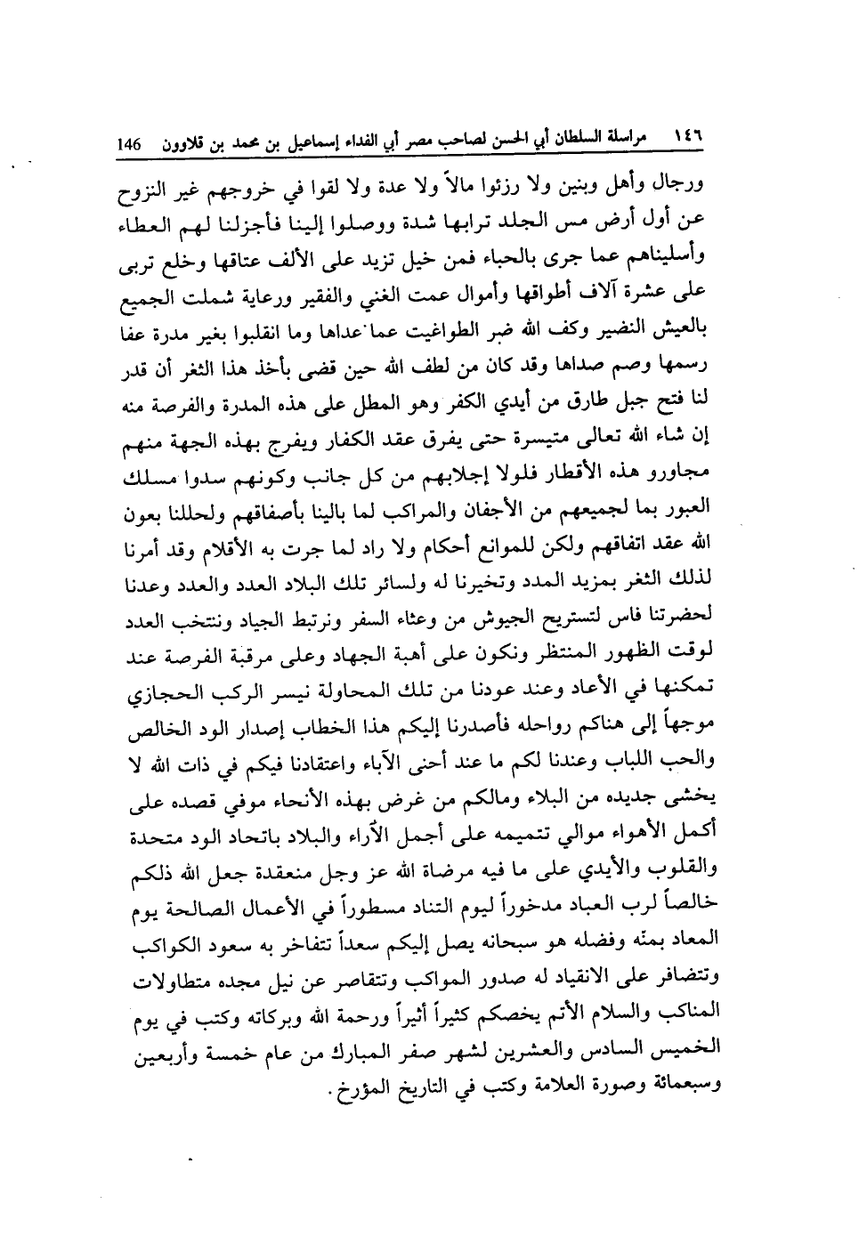 وَرِجَال وَأهل وبنين وَلَا رزئوا مَالا وَلَا عدَّة وَلَا لقوا فِي خُرُوجهمْ غير النزوح عَن أول أَرض مس الْجلد ترابها شدَّة ووصلوا إِلَيْنَا فأجزلنا لَهُم الْعَطاء وأسليناهم عَمَّا جرى بالحباء فَمن خيل تزيد على الْألف عتاقها وخلع تربى على عشرَة آلَاف أطواقها وأموال عَمت الْغَنِيّ وَالْفَقِير ورعاية شملت الْجَمِيع بالعيش النَّضِير كف الله ضرّ الطواغيت عَمَّا عَداهَا وَمَا انقلبوا بِغَيْر مَدَرَة عَفا رسمها وصم صداها وَقد كَانَ من لطف الله حِين قضى بِأخذ هَذَا الثغر أَن قدر لنا فتح جبل طَارق من أَيدي الْكفْر وَهُوَ المطل على هَذِه المدرة والفرصة مِنْهُ إِن شَاءَ الله تَعَالَى متيسرة حَتَّى يفرق عقد الْكفَّار ويفرج بِهَذِهِ الْجِهَة مِنْهُم مجاورو هَذِه الأقطار فلولا إجلابهم من كل جَانب وكونهم سدوا مَسْلَك العبور بِمَا لجميعهم من الأجفان والمراكب لما بالينا بأصفاقهم ولحللنا بعون الله عقد اتِّفَاقهم وَلَكِن للموانع أَحْكَام وَلَا راد لما جرت بِهِ الأقلام وَقد أمرنَا لذَلِك الثغر بمزيد المدد وتخيرنا لَهُ ولسائر تِلْكَ الْبِلَاد الْعدَد وَالْعدَد وعدنا لحضرتنا فاس لتستريح الجيوش من وعثاء السّفر ونرتبط الْجِيَاد وننتخب الْعدَد لوقت الظُّهُور المنتظر ونكون على أهبة الْجِهَاد وعَلى مرقبة الفرصة عِنْد تمكنها فِي الأعاد وَعند عودنا من تِلْكَ المحاولة نيسر الركب الْحِجَازِي موجها إِلَى هُنَاكُم رواحله فأصدرنا إِلَيْكُم هَذَا الْخطاب إصدار الود الْخَالِص وَالْحب اللّبَاب وَعِنْدنَا لكم مَا عِنْد أحنى الْآبَاء واعتقادنا فِيكُم فِي ذَات الله لَا يخْشَى جديده من الْبلَاء ومالكم من غَرَض بِهَذِهِ الأنحاء موفي قَصده على أكمل الْأَهْوَاء موَالِي تتميمه على أجمل الأراء والبلاد باتحاد الود متحدة والقلوب وَالْأَيْدِي على مَا فِيهِ مرضاة الله عز وَجل منعقدة جعل الله ذَلِكُم خَالِصا لرب الْعباد مدخورا ليَوْم التناد مسطورا فِي الْأَعْمَال الصَّالِحَة يَوْم الْمعَاد بمنه وفضله هُوَ سُبْحَانَهُ يصل إِلَيْكُم سَعْدا تتفاخر بِهِ سعود الْكَوَاكِب وتتضافر على الانقياد لَهُ صُدُور المواكب وتتقاصر عَن نيل مجده متطاولات المناكب وَالسَّلَام الأتم يخصكم كثيرا أثيرا وَرَحْمَة الله وَبَرَكَاته وَكتب فِي يَوْم الْخَمِيس السَّادِس وَالْعِشْرين لشهر صفر الْمُبَارك من عَام خَمْسَة وَأَرْبَعين وَسَبْعمائة وَصُورَة الْعَلامَة وَكتب فِي التَّارِيخ المؤرخ