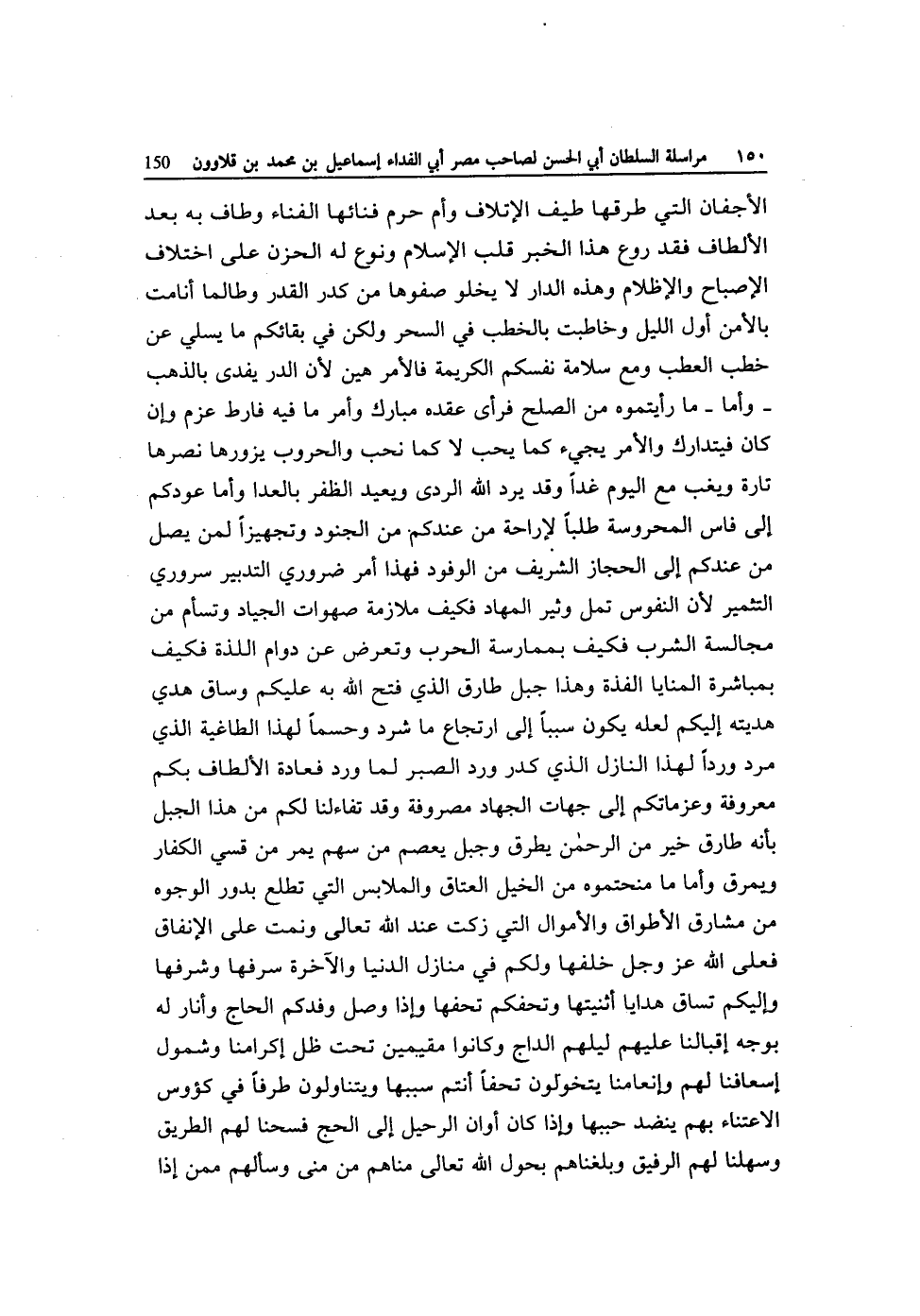 الأجفان الَّتِي طرقها طيف الْإِتْلَاف وَأم حرم فنائها الفناء وَطَاف بِهِ بعد الألطاف فقد روع هَذَا الْخَبَر قلب الْإِسْلَام وَنَوع لَهُ الْحزن على اخْتِلَاف الإصباح والإظلام وَهَذِه الدَّار لَا يَخْلُو صفوها من كدر الْقدر وطالما انامت بالأمن أول اللَّيْل وخاطبت بالخطب فِي السحر وَلَكِن فِي بقائكم مَا يسلي عَن خطب العطب وَمَعَ سَلامَة نفسكم الْكَرِيمَة فَالْأَمْر هَين لِأَن الدّرّ يفدى بِالذَّهَب وَأما مَا رَأَيْتُمُوهُ من الصُّلْح فَرَأى عقده مبارك وَأمر مَا فِيهِ فارط عزم وَإِن كَانَ فيتدارك وَالْأَمر يَجِيء كَمَا يحب لَا كَمَا نحب والحروب يزورها نصرها تَارَة ويغب مَعَ الْيَوْم غَدا وَقد يرد الله الردى وَيُعِيد الظفر بالعدا وَأما عودكم إِلَى فاس المحروسة طلبا لإراحة من عنْدكُمْ من الْجنُود وتجهيزا لمن يصل من عنْدكُمْ إِلَى الْحجاز الشريف من الْوُفُود فَهَذَا أَمر ضَرُورِيّ التَّدْبِير سروري التثمير لِأَن النُّفُوس تمل وثير المهاد فَكيف مُلَازمَة صهوات الْجِيَاد وتسأم من مجالسة الشّرْب فَكيف بممارسة الْحَرْب وَتعرض عَن دوَام اللَّذَّة فَكيف بِمُبَاشَرَة المنايا الفذة وَهَذَا جبل طَارق الَّذِي فتح الله بِهِ عَلَيْكُم وسَاق هدي هديته إِلَيْكُم لَعَلَّه يكون سَببا إِلَى ارتجاع مَا شرد وحسما لهَذَا الطاغية الَّذِي مرد وردا لهَذَا النَّازِل الَّذِي كدرر ورد الصَّبْر لما ورد فعادة الألطاف بكم مَعْرُوفَة وعزماتكم إِلَى جِهَات الْجِهَاد مصروفة وَقد تفاءلنا لكم من هَذَا الْجَبَل بِأَنَّهُ طَارق خير من الرَّحْمَن يطْرق وجبل يعْصم من سهم يمر من قسي الْكفَّار ويمرق وَأما مَا منحتموه من الْخَيل الْعتاق والملابس الَّتِي تطلع بدور الْوُجُوه من مَشَارِق الأطواق وَالْأَمْوَال الَّتِي زكتْ عِنْد الله تَعَالَى ونمت على الْإِنْفَاق فعلى الله عز وَجل خلفهَا وَلكم فِي منَازِل الدُّنْيَا وَالْآخِرَة سرفها وشرفها وإليكم تساق هَدَايَا أثنيتها وتحفكم تحفها وَإِذا وصل وفدكم الْحَاج وأنار لَهُ بِوَجْه إقبالنا عَلَيْهِم ليلهم الداج وَكَانُوا مقيمين تَحت ظلّ إكرامنا وشمول إسعافنا لَهُم وإنعامنا يتخولون تحفا أَنْتُم سَببهَا ويتناولون طرفا فِي كؤوس الاعتناء بهم ينضد حببها وَإِذا كَانَ أَوَان الرحيل إِلَى الْحَج فسحنا لَهُم الطَّرِيق وسهلنا لَهُم الرفيق وبلغناهم بحول الله تَعَالَى مُنَاهُمْ من منى وسألهم مِمَّن إِذا