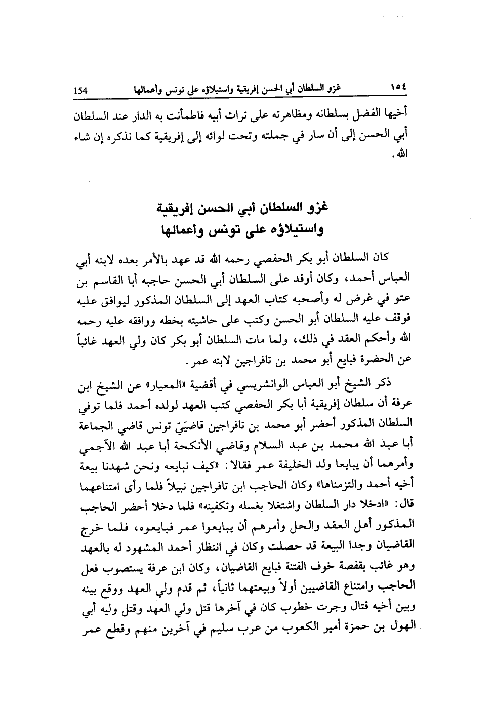 ذكر الشَّيْخ أَبُو الْعَبَّاس الوانشريسي فِي أقضية المعيار عَن الشَّيْخ ابْن عَرَفَة أَن سُلْطَان إفريقية أَبَا بكر الحفصي كتب الْعَهْد لوَلَده أَحْمد فَلَمَّا توفّي السُّلْطَان الْمَذْكُور أحضر أَبُو مُحَمَّد بن تافراجين قاضيي تونس قَاضِي الْجَمَاعَة أَبَا عبد الله مُحَمَّد بن عبد السَّلَام وقاضي الأنكحه أَبَا عبد الله الآجمي وَأَمرهمَا أَن يبايعا ولد الخليفه عمر فَقَالَا كَيفَ نُبَايِعهُ وَنحن شَهِدنَا بيعَة أَخِيه أَحْمد والتزمناها وَكَانَ الْحَاجِب ابْن تافراجين نبيلا فَلَمَّا دخلا أحضر الْحَاجِب الْمَذْكُور أهل العقد والحل وَأمرهمْ أَن يباييعوا عمر فَبَايعُوهُ فَلَمَّا خرج القاضيان وجدا الْبيعَة قد حصلت وَكَانَ فِي انْتِظَار أَحْمد الْمَشْهُود لَهُ بالعهد وَهُوَ غَائِب بقفصة خوف الْفِتْنَة فَبَايع القاضيان وَكَانَ ابْن عَرَفَة يستصوب فعل الْحَاجِب وَامْتِنَاع القاضيين أَولا وبيعتهما ثَانِيًا ثمَّ قدم ولي الْعَهْد وَوَقع بَينه وَبَين أَخِيه قتال وَجَرت خطوب كَانَ فِي آخرهَا قتل ولي الْعَهْد وَقتل وليه أبي الهول بن حَمْزَة أَمِير الكعوب من عرب سليم فِي آخَرين مِنْهُم وَقطع عمر