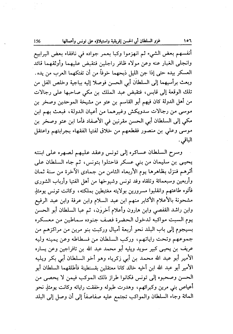 وسرح السُّلْطَان عساكره إِلَى تونس وَعقد عَلَيْهِم لصهره على ابْنَته يحيى بن سُلَيْمَان من بني عَسْكَر فاحتلوا بتونس ثمَّ جَاءَ السُّلْطَان على أَثَرهم فَنزل بظاهرها يَوْم الْأَرْبَعَاء الثَّامِن من جُمَادَى الْآخِرَة من سنة ثَمَان وَأَرْبَعين وَسَبْعمائة وتلقاه وَفد تونس وشيوخها من أهل الْفتيا وأرباب الشورى فآتوه طاعتهم وانقلبوا مسرورين بولايته مغتبطين بملكته وَكَانَت تونس يَوْمئِذٍ مشحونة بالأعلام الأكابر مِنْهُم ابْن عبد السَّلَام وَابْن عَرَفَة وَابْن عبد الرفيع وَابْن رَاشد القفصي وَابْن هَارُون وأعلام آخَرُونَ ثمَّ عبا السُّلْطَان أَبُو الْحسن يَوْم السبت مواكبه لدُخُول الحضرة فَصف جُنُوده سماطين من مُعَسْكَره بسيجوم إِلَى بَاب الْبَلَد نَحْو أَرْبَعَة أَمْيَال وَركبت بَنو مرين من مراكزهم من جموعهم وَتَحْت راياتهم وَركب السُّلْطَان من فسطاطه وَعَن يَمِينه وليه عريف بن يحييى كَبِير سُوَيْد ويليه أَبُو مُحَمَّد عبد الله بن تافراجين وَعَن يسَاره الْأَمِير أ [وَعبد الله مُحَمَّد بن أبي زَكَرِيَّاء وَهُوَ أَخُو السُّلْطَان أبي بكر ويليه الْأَمِير أَبُو عبد الله ابْن أَخِيه خَالِد كَانَا معتقلين بقسنطينة فأطلقهما السُّلْطَان أَبُو الْحسن وصحببوه إِلَى تونس فَكَانُوا طراز ذَلِك الموكب فِيمَن لَا يُحْصى من أعياص بني مرين وكبرائهم وهدرت طبوله وخفقت راياته وَكَانَت يَوْمئِذٍ نَحْو الْمِائَة وَجَاء السُّلْطَان والمواكب تَجْتَمِع عَلَيْهِ صفاصفا إِلَى أَن وصل إِلَى الْبَلَد