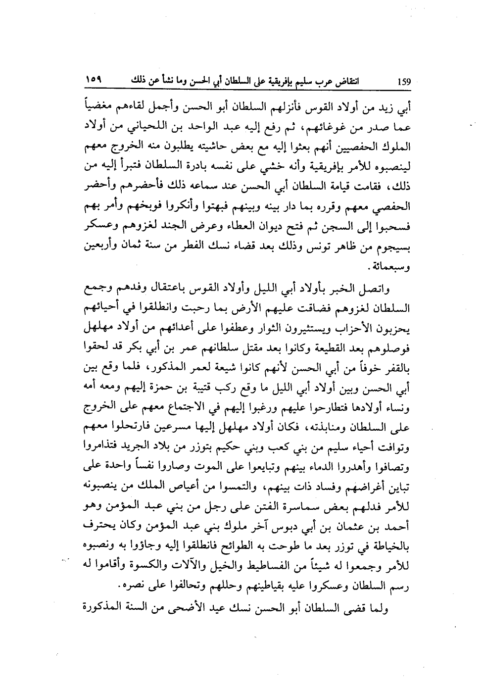 أبي زيد أَوْلَاد الْقوس فأنزلهم السُّلْطَان أَبُو الْحسن وأجمل لقاءهم مغضبا عَمَّا صدر من غوغاتهم ثمَّ رفع إِلَيْهِ عبد الْوَاحِد بن اللحياني من أَوْلَاد الْمُلُوك الحفصيين أَنهم بعثوا إِلَيْهِ مَعَ بعض حَاشِيَته يطْلبُونَ مِنْهُ الْخُرُوج مَعَهم لينصبوه لِلْأَمْرِ بإفريقية وَأَنه خشِي على نَفسه بادرة السُّلْطَان فتبرأ إِلَيْهِ من ذَلِك فَقَامَتْ قِيَامَة السُّلْطَان أبي الْحسن عِنْد سَمَاعه ذَلِك فأحضرهم وأحضر الحفصي مَعَهم وَقَررهُ بِمَا دَار بَينه وَبينهمْ فَبُهِتُوا وأنكروا فوبخهم وَأمر بهم فسحبوا إِلَى السجْن ثمَّ فتح ديوَان الْعَطاء وَعرض الْجند لغزوهم وعسكر بسيجوم من ظَاهر تونس وَذَلِكَ بعد قَضَاء نسك الْفطر من سنة ثَمَان وَأَرْبَعين وَسَبْعمائة