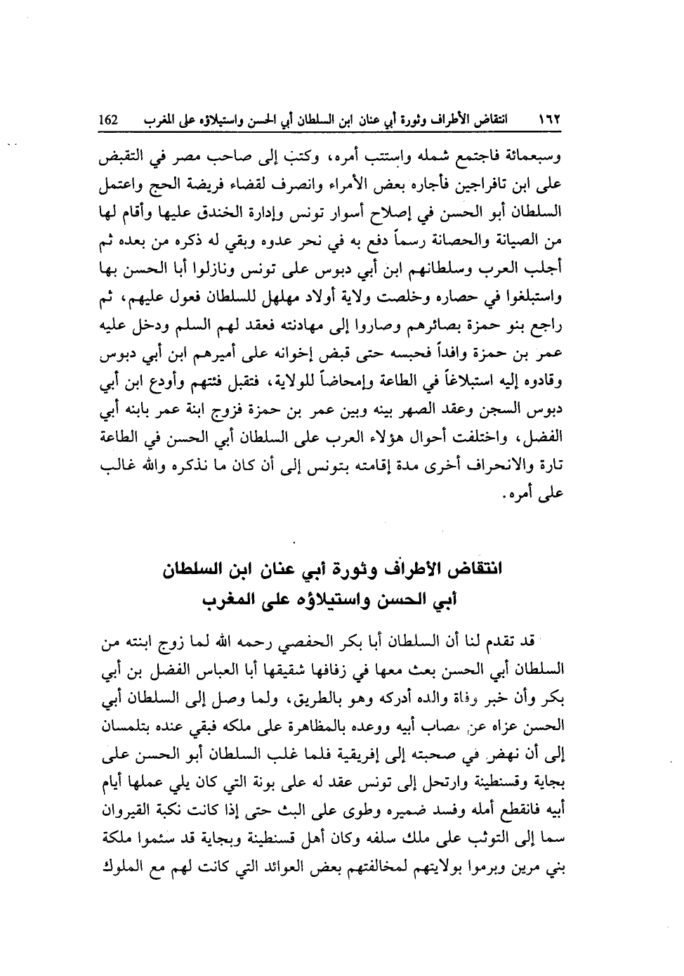 قد تقدم لنا أَن السُّلْطَان أَبَا بكر الحفصي رَحمَه الله لما زوج ابْنَته من السُّلْطَان أبي الْحسن بعث مَعَهُمَا فِي زفافها شقيقها أَبَا الْعَبَّاس الْفضل بن أبي بكر وَأَن خبر وَفَاة وَالِده أدْركهُ وَهُوَ بِالطَّرِيقِ وَلما وصل إِلَى السُّلْطَان أبي الْحسن عزاهُ عَن مصاب أَبِيه ووعده بالمظاهرة على ملكه فَبَقيَ عِنْده بتلمسان إِلَى أَن نَهَضَ فِي صحبته إِلَى إفريقية فَلَمَّا غلب السُّلْطَان أَبُو الْحسن على بجاية وقسنطينة وارتحل إِلَى تونس عقد لَهُ على بونة الَّتِي كَانَ يَلِي عَملهَا أَيَّام أَبِيه فَانْقَطع أمله وَفَسَد ضَمِيره وطوى على البث حَتَّى إِذا كَانَت نكبة القيروان سما إِلَى التوثب على ملك سلفه وَكَانَ أهل قسنطينة وبجاية قد سئموا ملكة بني مرين وبرموا بولايتهم لمخالفتهم بعض العوائد الَّتِي كَانَت لَهُم مَعَ الْمُلُوك
