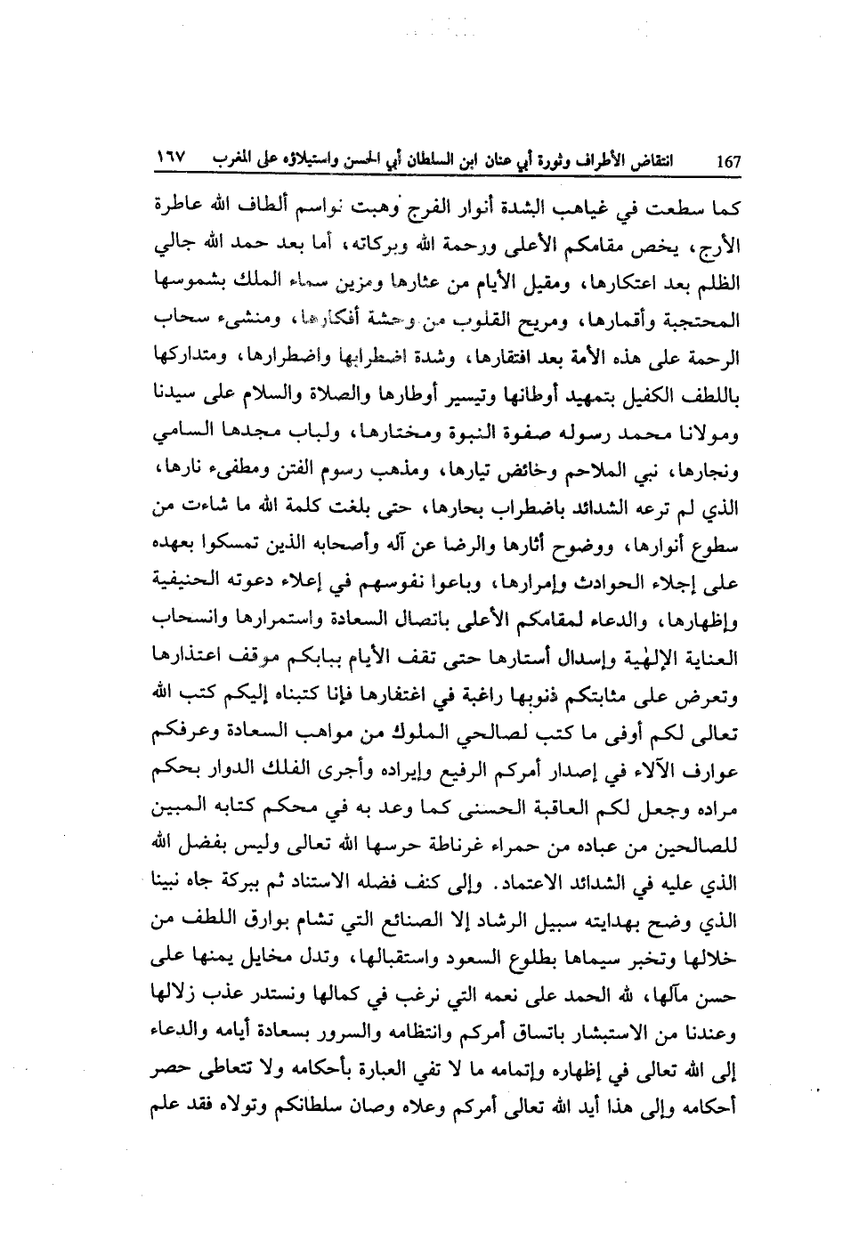 كَمَا سطعت فِي غياهب الشدَّة أنوار الْفرج وهبت نواسم ألطاف الله عاطة الأرج يخص مقامكم الْأَعْلَى وَرَحْمَة الله وَبَرَكَاته أما بعد حمد اله جالي الظُّلم بعد اعتكارها ومقيل الْأَيَّام من عثارها ومزين سَمَاء الْملك بشموسها المحتجبة وأقمارها ومريح الْقُلُوب من وَحْشَة أفكارها ومنشئ سَحَاب الرَّحْمَة على هَذِه الْأمة بعد افتقارها وَشدَّة اضطرابها ومتداكها باللطف الْكَفِيل بتمهيد أوطانها وتيسير أوطارها وَالصَّلَاة وَالسَّلَام على سيدنَا ومولانا مُحَمَّد رَسُوله صفوة النُّبُوَّة ومختارها ولباب مجدها السَّامِي ونجارها نَبِي الْمَلَاحِم وخائض تيارها وَمذهب رسوم الْفِتَن ومطفئ نارها الَّذِي لم ترعه الشدائد باضطراب بحارها حَتَّى بلغت كلمة الله مَا شَاءَت من سطوع أنوارها ووضوح أثارها وَالرِّضَا عَن آله وَأَصْحَابه الَّذين تمسكوا بعهده على إجلاء الْحَوَادِث وإمرارها وَبَاعُوا نُفُوسهم فِي إعلاء دَعوته الحنيفية وإظهارها وَالدُّعَاء لمقامكم الْأَعْلَى باتصال السَّعَادَة واستمرارها وانسحاب الْعِنَايَة الإلهية وإسدال أستارها حَتَّى تقف الْأَيَّام بباكم موقف اعتذارها وَتعرض على مثابتكم ذنوبها راغبة فِي اغتفارها فَإنَّا كتبناه إِلَيْكُم كتب الله تَعَالَى لكم أوفى مَا كتب لصالحي الْمُلُوك من مواهب السَّعَادَة وعرفكم عوارف الآلاء فِي إصدار أَمركُم الرفيع وإيراده وأجرى الْفلك الدوار بِحكم مُرَاده وَجعل لكم الْعَاقِبَة الْحسنى كَمَا وعد بِهِ فِي مُحكم كِتَابه الْمُبين للصالحين من عباده من حَمْرَاء غرناطة حرسها الله تَعَالَى وَلَيْسَ بِفضل الله الَّذِي عَلَيْهِ فِي الشدائد الِاعْتِمَاد وَإِلَى كنف فَضله الِاسْتِنَاد ثمَّ ببركة جاه نَبينَا الَّذِي وضح بهدايته سَبِيل الرشاد إِلَّا الصَّنَائِع الَّتِي تشام بوراق اللطف من خلالها وتخبر سيماها بِطُلُوع السُّعُود واستقبالها وتدل مخايل يمنها على حسن مآلها لله الْحَمد على نعمه الَّتِي نرغب فِي كمالها ونستدر عذب زلالها وَعِنْدنَا من الاستبشار باتساق أَمركُم وانتظامه وَالسُّرُور بسعادة أَيَّامه وَالدُّعَاء إِلَى الله تَعَالَى فِي إِظْهَاره وإتمامه مَا لَا تفي الْعبارَة بأحكامه وَلَا تتعاطى حصر أَحْكَامه وَإِلَى هَذَا أيد الله تَعَالَى أَمركُم وعلاه وصان سلطانكم وتولاه فقد علم