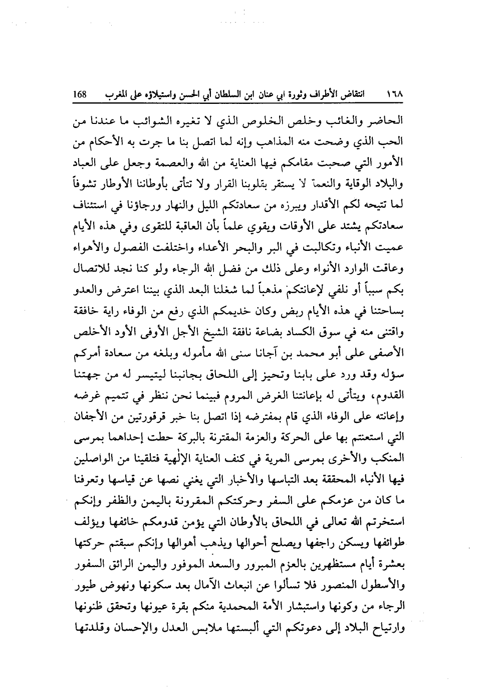 الْحَاضِر وَالْغَائِب وخلص الخلوص الَّذِي لَا تغيره الشوائب مَا عندنَا من الْحبّ الَّذِي وضحت مِنْهُ الْمذَاهب وَإنَّهُ لما اتَّصل بِنَا مَا جرت بِهِ الْأَحْكَام من الْأُمُور الَّتِي صَحِبت مقامكم فِيهَا الْعِنَايَة من الله والعصمة وَجعل على الْعباد والبلاد الْوِقَايَة وَالنعْمَة لَا يسْتَقرّ بقلوبنا الْقَرار وَلَا تتأتى بأوطاننا الأوطار تشوفا لما تتيحه لكم الأقدار ويبرزه من سعادتكم اللَّيْل وَالنَّهَار ورجاؤنا فِي اسْتِئْنَاف سعادتكم يشْتَد على الْأَوْقَات وَيُقَوِّي علما بِأَن الْعَاقِبَة للتقوى وَفِي هَذِه الْأَيَّام عميت الأنباء وتكالبت فِي الْبر وَالْبَحْر الْأَعْدَاء وَاخْتلفت الْفُصُول والأهواء وعاقت الْوَارِد الأنواء وعَلى ذَلِك من فضل الله الرَّجَاء وَلَو كُنَّا نجد للاتصال بكم سَببا أَو نلقي لإعانتكم مذهبا لما شغلنا الْبعد الَّذِي بَيْننَا اعْترض والعدو بساحتنا فِي هَذِه الْأَيَّام ربض وَكَانَ خديمكم الَّذِي رفع من الْوَفَاء راية خافقة واقتنى مِنْهُ فِي سوق الكساد بضَاعَة نافقة الشَّيْخ الْأَجَل الأوفى الأود الأخلص الأصفى على أَبُو مُحَمَّد بن آجانا سنى الله مأموله وبلغه من سَعَادَة أَمركُم سؤله وَقد ورد على بابنا وتحيز إِلَى اللحاق بجانبنا ليتيسر لَهُ من جهتنا الْقدوم ويتأتى لَهُ بإعانتنا الْغَرَض المروم فَبَيْنَمَا نَحن نَنْظُر فِي تتميم غَرَضه وإعانته على الْوَفَاء الَّذِي قَامَ بمفترضه إِذا اتَّصل بِنَا خبر قرقورتين من الأجفان الَّتِي استعنتم بهَا على الْحَرَكَة والعزمة المقترنة بِالْبركَةِ حطت إِحْدَاهمَا بمرسى الْمنْكب وَالْأُخْرَى بمرسى المرية فِي كنف الْعِنَايَة الإلهية فتلقينا من الواصلين فِيهَا الأنباء المحققة بعد التباسها وَالْأَخْبَار الَّتِي يُغني نَصهَا عَن قياسها وتعرفنا مَا كَانَ من عزمكم على السّفر وحركتكم المقرونة بِالْيمن وَالظفر وَإِنَّكُمْ استخرتم الله تَعَالَى فِي اللحاق بالأوطان الَّتِي يُؤمن قدومكم خائفها ويؤلف طوائفها ويسكن راجفها وَيصْلح أحوالها وَيذْهب أهوالها وَإِنَّكُمْ سبقتم حركتها بِعشْرَة أَيَّام مستظهرين بالعزم المبرور والسعد الموفور واليمن الرَّائِق السفور والأسطول الْمَنْصُور فَلَا تسألوا عَن انبعاث الآمال بعد سكونها ونهوض طيور الرَّجَاء من وَكَونهَا واستبشار الْأمة المحمدية مِنْكُم بقرة عيونها وَتحقّق ظنونها وارتياح الْبِلَاد إِلَى دعوتكم الَّتِي ألبستها ملابس الْعدْل وَالْإِحْسَان وقلدتها