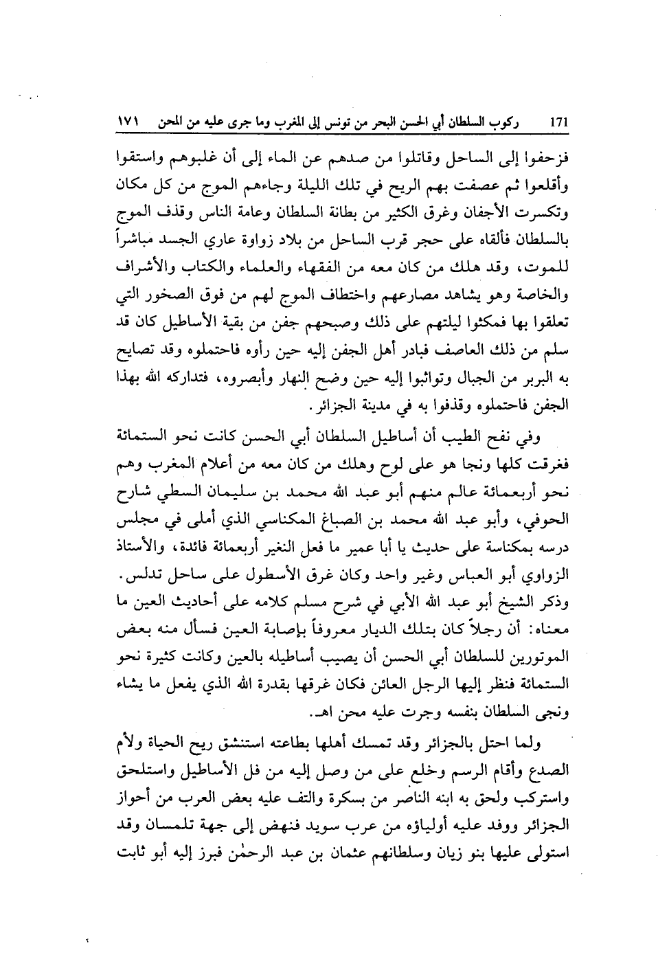 وَفِي نفح الطّيب أَن أساطيل السُّلْطَان أبي الْحسن كَانَت نَحْو الستمائة فغرقت كلهَا وَنَجَا هُوَ على لوح وَهلك من كَانَ مَعَه من أَعْلَام الْمغرب وهم نَحْو أَرْبَعمِائَة عَالم مِنْهُم أَبُو عبد الله مُحَمَّد بن سُلَيْمَان السطي شَارِح الحوفي وَأَبُو عبد الله مُحَمَّد بن الصّباغ المكناسي الَّذِي أمْلى فِي مجْلِس درسه بمكناسة على حَدِيث يَا ابا عُمَيْر مَا فعل النغير أَرْبَعمِائَة فَائِدَة والأستاذ الزواوي أَبُو الْعَبَّاس وَغير وَاحِد وَكَانَ غرق الأسطول على سَاحل تدلس وَذكر الشَّيْخ أَبُو عبد الله الأبي فِي شرح مُسلم كَلَامه على أَحَادِيث الْعين مَا مَعْنَاهُ أَن رجلا كَانَ بِتِلْكَ الديار مَعْرُوفا بِإِصَابَة الْعين فَسَأَلَ مِنْهُ بعض الموتورين للسُّلْطَان أبي الْحسن أَن يُصِيب أساطيله بِالْعينِ وَكَانَت كَثِيرَة نَحْو الستمائة فَنظر إِلَيْهَا الرجل العائن فَكَانَ غرقها بقدرة الله الَّذِي يفعل مَا يَشَاء ونجى السُّلْطَان بِنَفسِهِ وَجَرت عَلَيْهِ محن اه