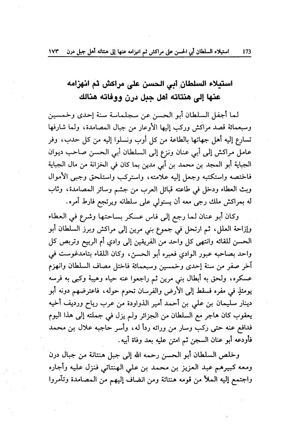 وَكَانَ أَبُو عنان لما رَجَعَ إِلَى فاس عَسْكَر بساحتها وَشرع فِي الْعَطاء وإزاحة الْعِلَل ثمَّ ارتحل فِي جموع بني مرين إِلَى مراكش وبرز السُّلْطَان أَبُو الْحسن للقائه وانْتهى كل وَاحِد من الْفَرِيقَيْنِ إِلَى وَادي أم الرّبيع وتربص كل وَاحِد بِصَاحِبِهِ عبور الْوَادي فعبره أَبُو الْحسن وَكَانَ اللِّقَاء بتامد غوست فِي آخر صفر من سنة إِحْدَى وَخمسين وَسَبْعمائة فاختل مصَاف السُّلْطَان وَانْهَزَمَ عسكره وَلحق بِهِ أبطال بني مرين ثمَّ راجعوا عَنهُ حَيَاء وهيبة وكبى بِهِ فرسه يَوْمئِذٍ فِي مفره فَسقط إِلَى الأَرْض والفرسان تحوم حوله فاعترضهم دونه أَبُو دِينَار سُلَيْمَان بن عَليّ بن أَحْمد أَمِير الذواودة من عرب ريَاح ورديف أَخِيه يَعْقُوب كَانَ هَاجر مَعَ السُّلْطَان من الجزائر وَلم يزل فِي جملَته إِلَى هَذَا الْيَوْم فدافع عَنهُ حَتَّى ركب وَسَار من وَرَائه ردا لَهُ وَأسر حَاجِبه علال بن مُحَمَّد فأودعه أَبُو عنان السجْن ثمَّ امتن عَلَيْهِ بعد وَفَاة أَبِيه