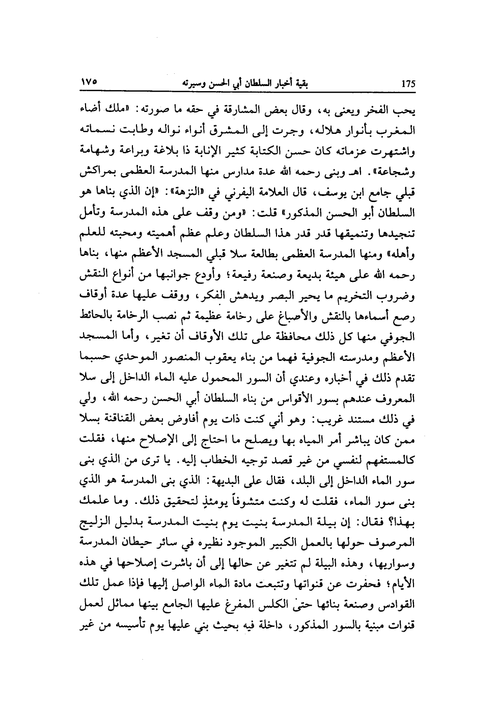 يحب الْفَخر ويعنى بِهِ وَقَالَ بعض المشارقة فِي حَقه مَا صورته ملك أَضَاء الْمغرب بأنوار هلاله وَجَرت إِلَى الْمشرق أنواء نواله وَطَابَتْ نسماته واشتهرت عزماته كَانَ حسن الْكِتَابَة كثير الْإِنَابَة ذَا بلاغة وبراعة وشهامة وشجاعة اه وَبنى رَحمَه الله عدَّة مدارس مِنْهَا الْمدرسَة الْعُظْمَى بمراكش قبلي جَامع ابْن يُوسُف قَالَ الْعَلامَة اليفرني فِي النزهة إِن الَّذِي بناها هُوَ السُّلْطَان أَبُو الْحسن الْمَذْكُور قلت وَمن وقف على هَذِه الْمدرسَة وَتَأمل تنجيدها وتنميقها قدر هَذَا السُّلْطَان وَعلم عظم أهميته ومحبته للْعلم وَأَهله وَمِنْهَا الْمدرسَة الْعُظْمَى بطالعه سلا قبلي الْمَسْجِد الْأَعْظَم مِنْهَا بناها رَحمَه الله على هَيْئَة بديعة وصنعة رفيعة وأودع جوانبها من أَنْوَاع النقش وضروب التخريم مَا يحير الْبَصَر ويدهش الْفِكر ووقف عَلَيْهَا عدَّة أوقاف رصع أسماءها بالنقش والأصباغ على رخامة عَظِيمَة ثمَّ نصب الرخامة بِالْحَائِطِ الجوفي مِنْهَا كل ذَلِك مُحَافظَة على تِلْكَ الْأَوْقَاف أَن تغير وَأما الْمَسْجِد الْأَعْظَم ومدرسته الجوفية فهما من بِنَاء يَعْقُوب الْمَنْصُور الموحدي حَسْبَمَا تقدم ذَلِك فِي أخباره وَعِنْدِي أَن السُّور الْمَحْمُول عَلَيْهِ المَاء الدَّاخِل إِلَى سلا الْمَعْرُوف عِنْدهم بسور الأقواس من بِنَاء السُّلْطَان أبي الْحسن رَحمَه الله ولي فِي ذَلِك مُسْتَند غَرِيب وَهُوَ أَنِّي كنت ذَات يَوْم أفاوض بعض القناقنة بسلا مِمَّن كَانَ يُبَاشر أَمر الْمِيَاه بهَا وَيصْلح مَا احْتَاجَ إِلَى الْإِصْلَاح مِنْهَا فَقلت كالمستفهم لنَفْسي من غير قصد تَوْجِيه الْخطاب إِلَيْهِ يَا ترى من الَّذِي بنى سور المَاء الدَّاخِل إِلَى الْبَلَد فَقَالَ على البديهة الَّذِي بنى الْمدرسَة هُوَ الَّذِي بنى سور المَاء فَقلت لَهُ وَكنت متشوفا يَوْمئِذٍ لتحقيق ذَلِك وَمَا علمك بِهَذَا فَقَالَ إِن بيلة الْمدرسَة بنيت يَوْم بنيت الْمدرسَة بِدَلِيل الزليج المرصوف حولهَا بِالْعَمَلِ الْكَبِير الْمَوْجُود نَظِيره فِي سَائِر حيطان الْمدرسَة وسواريها وَهَذِه البيلة لم تَتَغَيَّر عَن حَالهَا إِلَى أَن باشرت إصلاحها فِي هَذِه الْأَيَّام فحفرت عَن قنواتها وتتبعت مَادَّة المَاء الْوَاصِل إِلَيْهَا فَإِذا عمل تِلْكَ القوادس وصنعة بنائها حَتَّى الكلس المفرغ عَلَيْهَا الْجَامِع بَينهَا مماثل لعمل قنوات مَبْنِيَّة بالسور الْمَذْكُور دَاخِلَة فِيهِ بِحَيْثُ بنى عَلَيْهَا يَوْم تأسيسه من غير
