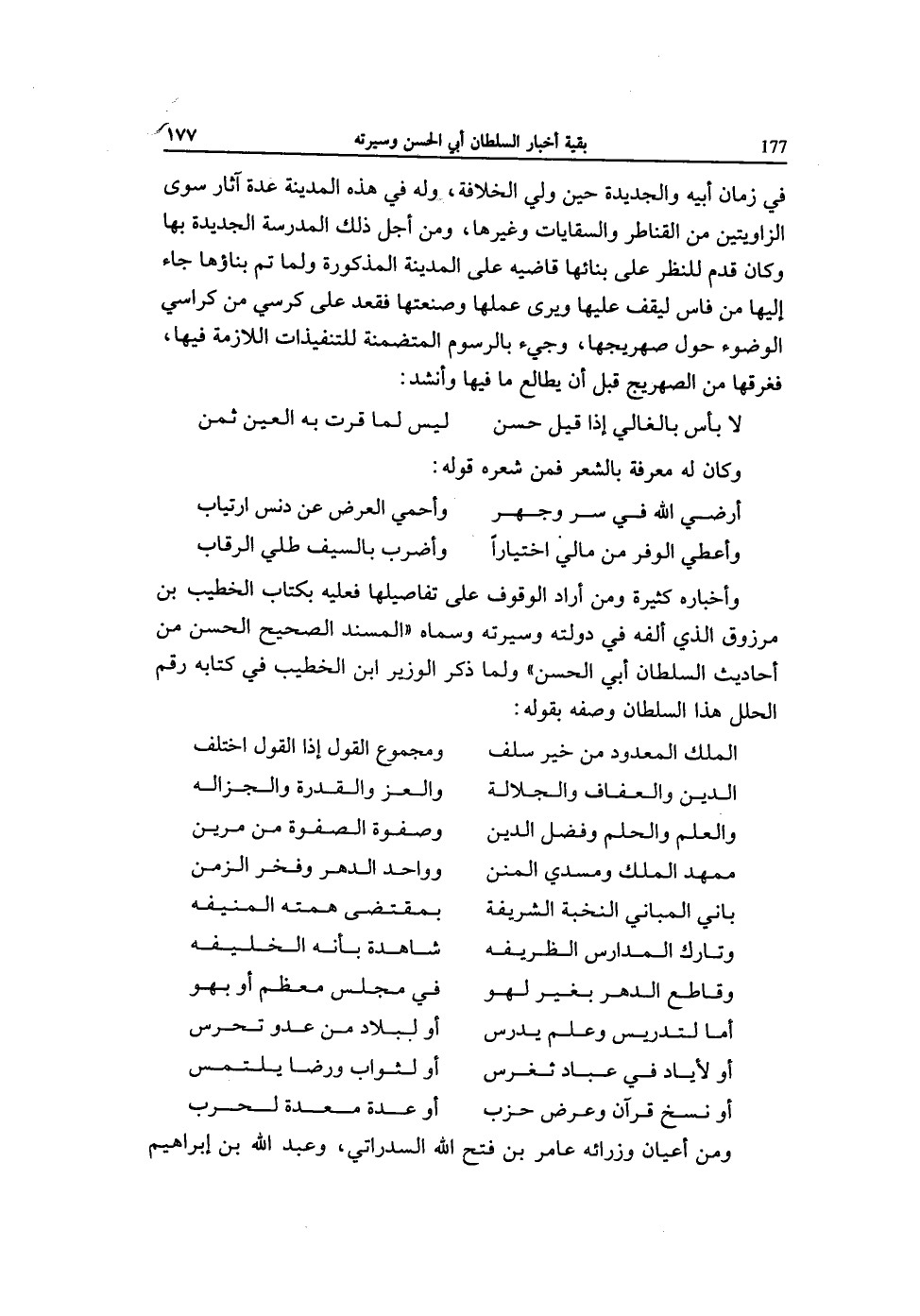 وأخباره كَثِيرَة وَمن أَرَادَ الْوُقُوف على تفاصيلها فَعَلَيهِ بِكِتَاب الْخَطِيب بن مَرْزُوق الَّذِي أَلفه فِي دولته وَسيرَته وَسَماهُ الْمسند الصَّحِيح الْحسن من أَحَادِيث السُّلْطَان أبي الْحسن وَلما ذكر الْوَزير ابْن الْخَطِيب فِي كِتَابه رقم الْحلَل هَذَا السُّلْطَان وَصفه بقوله