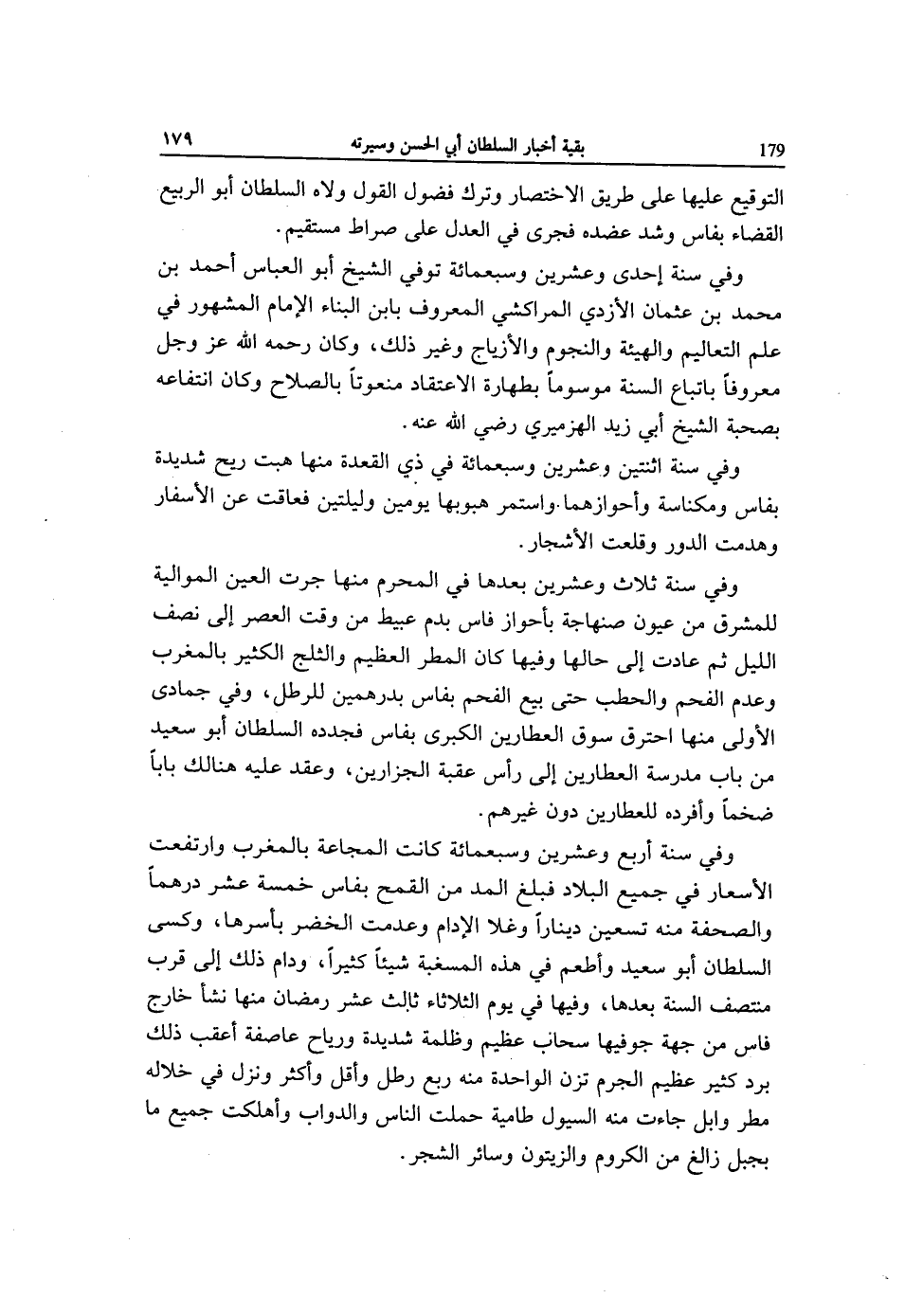 وَفِي سنة ثَلَاث وَعشْرين بعْدهَا فِي الْمحرم مِنْهَا جرت الْعين الموالية للمشرق من عُيُون صنهاجة بأحواز فاس بِدَم عبيط من وَقت الْعَصْر إِلَى نصف اللَّيْل ثمَّ عَادَتْ إِلَى حَالهَا وفيهَا كَانَ الْمَطَر الْعَظِيم والثلج الْكثير بالمغرب وَعدم الفحم والحطب حَتَّى بيع الفحم بفاس بِدِرْهَمَيْنِ للرطل وَفِي جُمَادَى الأولى مِنْهَا احْتَرَقَ سوق العطارين الْكُبْرَى بفاس فجدده السُّلْطَان أَبُو سعيد من بَاب مدرسة العطارين إِلَى رَأس عقبَة الجزارين وَعقد عَلَيْهِ هُنَالك بَابا ضخما وأفرده للعطارين دون غَيرهم