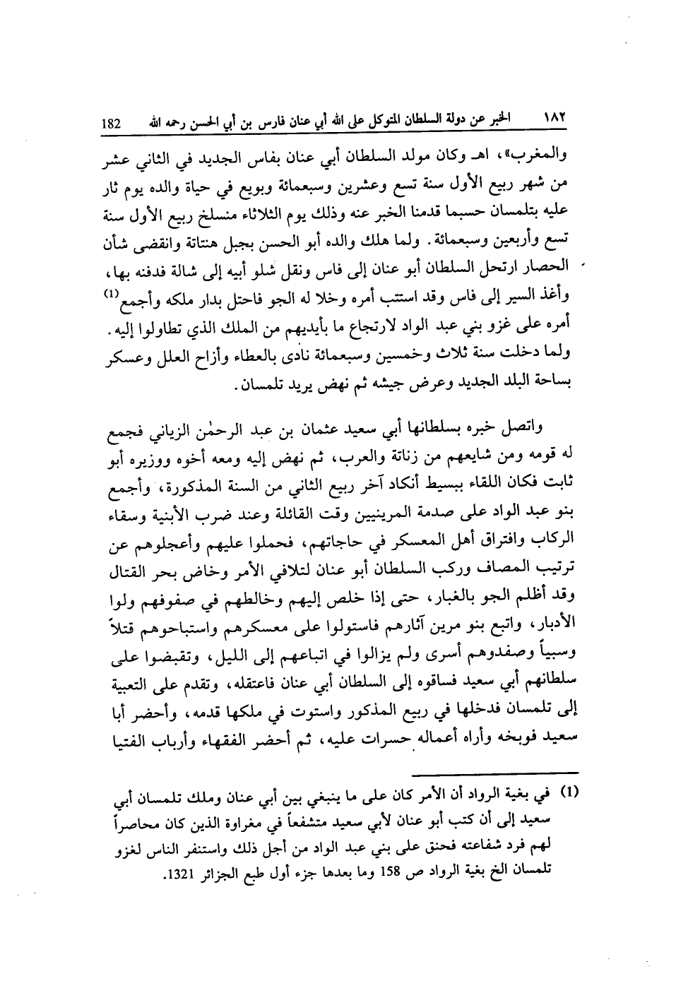 واتصل خَبره بسلطانها أبي سعيد عُثْمَان بن عبد الرَّحْمَن الزياني فَجمع لَهُ قومه وَمن شايعهم من زناتة وَالْعرب ثمَّ نَهَضَ إِلَيْهِ وَمَعَهُ أَخُوهُ ووزيره أَبُو ثَابت فَكَانَ اللِّقَاء ببسيط أَن كَاد آخر ربيع الثَّانِي من السّنة المكذورة وَأجْمع بَنو عبد الواد على صدمة المرينيين وَقت القائلة وَعند ضرب الْأَبْنِيَة وسقاء الركاب وافتراق أهل المعسكر فِي حاجاتهم فحملوا عَلَيْهِم وأعجلوهم عَن تَرْتِيب المصاف وَركب السُّلْطَان أَبُو عنان لتلافي الْأَمر وخاض بَحر الْقِتَال وَقد أظلم الجو بالغبار حَتَّى إِذا خلص إِلَيْهِم وخالطم فِي صفوفهم ولوا الأدبار وَاتبع بَنو مرين آثَارهم فاستولوا على معسكرهم واستباحوهم قتلا وسبيا وصفدوهم أسرى وَلم يزَالُوا فِي اتباعهم إِلَى اللَّيْل وتقبضوا على سلطانهم أبي سيعد فساقوه إِلَى السُّلْطَان أبي عنان فاعتقله وَتقدم على التعبية إِلَى تلمسان فَدَخلَهَا فِي ربيع الْمَذْكُور واستوت فِي ملكهَا قدمه وأحضر أَبَا سعيد فوبخه وَأرَاهُ أَعماله حسرات عَلَيْهِ ثمَّ أحضر الْفُقَهَاء وأرباب الْفتيا