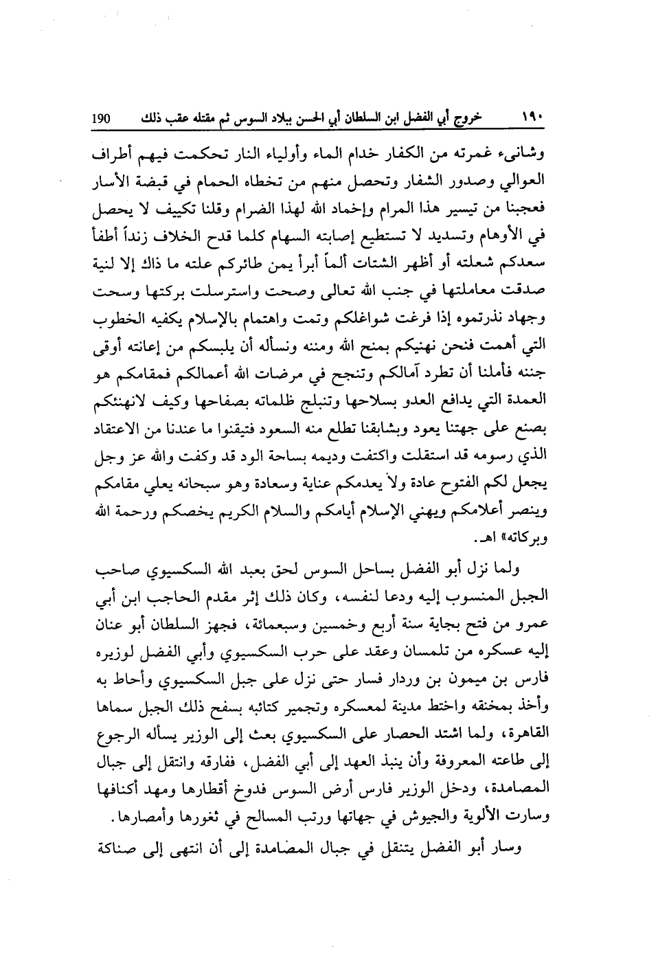وشانئ غمرته من الْكفَّار خدام المَاء وأولياء النَّار تحكمت فيهم أَطْرَاف العوالي وصدور الشفار وَتحصل مِنْهُم من تخطاه الْحمام فِي قَبْضَة الأسار فعجبنا من تيسير هَذَا المرام وإخماد الله لهَذَا الضرام وَقُلْنَا تكييف لَا يحصل فِي الأوهام وتسديد لَا تَسْتَطِيع إِصَابَته السِّهَام كلما قدح الْخلاف زندا أطفأ سعدكم شعلته أَو أظهر الشتات ألما أَبْرَأ يمن طائركم علته مَا ذَاك إِلَّا لنِيَّة صدقت معاملتها فِي جنب الله تَعَالَى وَصحت واسترسلت بركتها وسحت وَجِهَاد نذرتموه إِذا فرغت شواغلكم وتمت واهتمام بِالْإِسْلَامِ يَكْفِيهِ الخطوب الَّتِي أهمت فَنحْن نهنيكم بمنح الله ومننه ونسأله أَن يلْبِسكُمْ من إعانته أوقى جننه فأملنا أَن تطرد آمالكم وتنجح فِي مرضات الله أَعمالكُم فمقامكم هُوَ الْعُمْدَة الَّتِي يدافع الْعَدو بسلاحها وتنبلج ظلماته بصفاحها وَكَيف لانهنئكم بصنع على جهتنا يعود وبشابقنا تطلع مِنْهُ السُّعُود فتيقنوا مَا عندنَا من الِاعْتِقَاد الَّذِي رسومه قد اسْتَقَلت وكتفت وديمه بِسَاحَة الود قد وكفت وَالله عز وَجل يَجْعَل لكم الْفتُوح عَادَة وَلَا يعدمكم عناية وسعادة وَهُوَ سُبْحَانَهُ يعلي مقامكم وينصر أعلامكم ويهني الْإِسْلَام أيامكم وَالسَّلَام الْكَرِيم يخصكم وَرَحْمَة الله وَبَرَكَاته اه