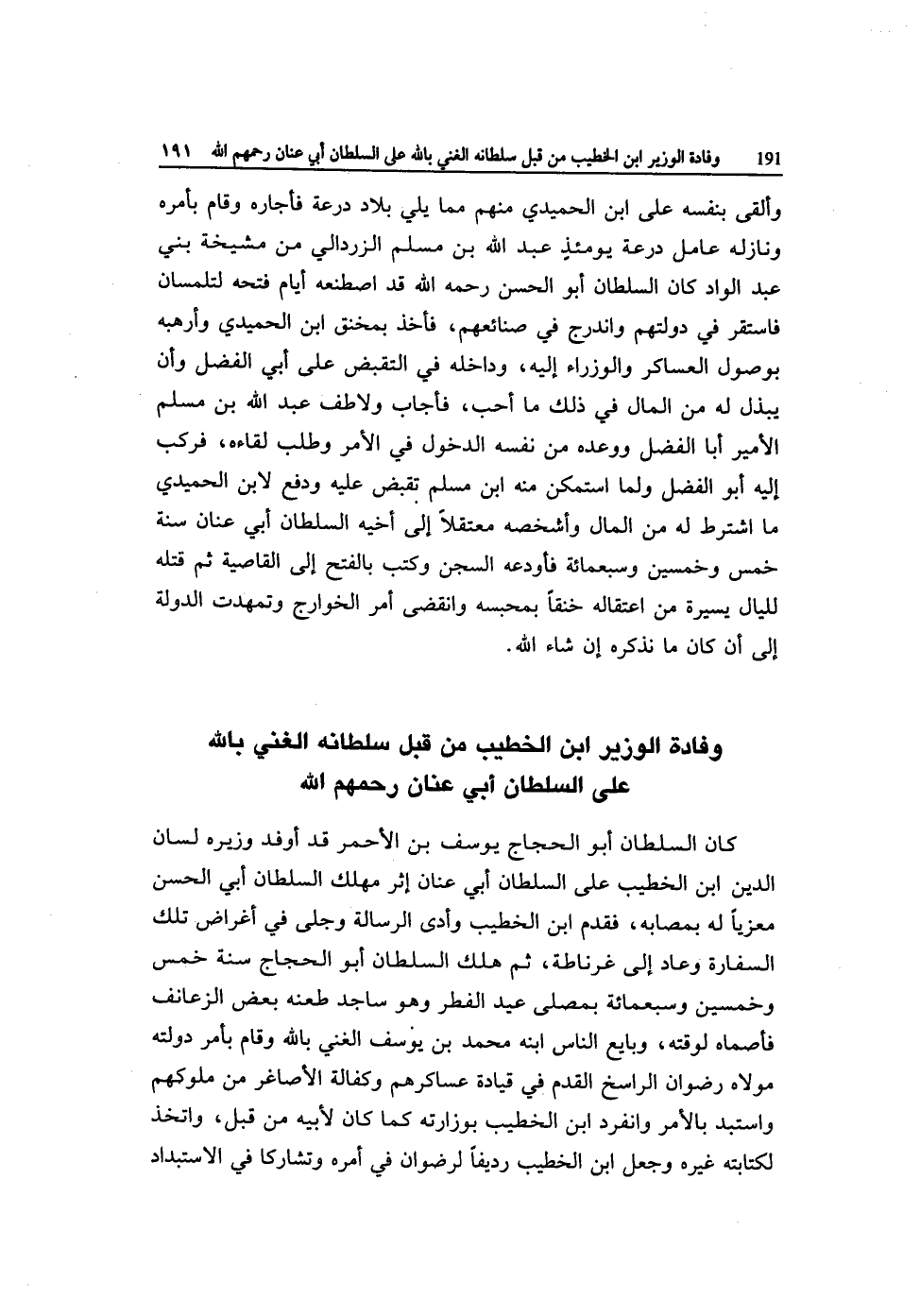 وفادة الْوَزير ابْن الْخَطِيب من قبل سُلْطَانه الْغَنِيّ بِاللَّه على السُّلْطَان أبي عنان رَحِمهم الله