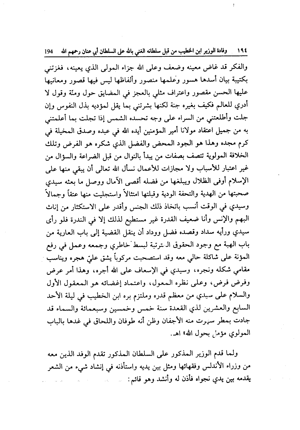 والفكر قد غاض مُعينَة وَضعف وعَلى الله جَزَاء الْمولى الَّذِي يُعينهُ فغزتني بكتيبتي بَيَان أسدها هسور وَعلمهَا مَنْصُور وألفاظها لَيْسَ فِيهَا قُصُور ومعانيها عَلَيْهَا الْحسن مَقْصُور واعتراف مثلي بِالْعَجزِ فِي المضايق حول وَمِنْه وَقَول لَا أَدْرِي للْعَالم فَكيف بِغَيْرِهِ جنَّة لَكِنَّهَا بشرتني بِمَا يقل لمؤديه بذل النُّفُوس وَإِن جلت وأطلعتني من السَّرَّاء على وَجه تحسده الشَّمْس إِذا تجلت بِمَا أعلمتني بِهِ من جميل اعْتِقَاد مَوْلَانَا أَمِير الْمُؤمنِينَ أيده الله فِي عَبده وَصدق المخيلة فِي كرم مجده وَهَذَا هُوَ الْجُود الْمَحْض وَالْفضل الَّذِي شكره هُوَ الْفَرْض وَتلك الْخلَافَة المولوية تتصف بِصِفَات من يبْدَأ بالنوال من قبل الضراعة وَالسُّؤَال من غير اعْتِبَار للأسباب وَلَا مجازات للأعمال نسْأَل الله تَعَالَى أَن يبقي مِنْهَا على الْإِسْلَام أَو فِي الظلال ويبلغها من فَضله أقْصَى الآمال وَوصل مَا بَعثه سَيِّدي صحبتهَا من الْهَدِيَّة والتحفة الودية وقبلتها امتثالا واستجليت مِنْهَا عتقا وجمالا وسيدي فِي الْوَقْت أنسب باتخاذ ذَلِك الْجِنْس وأقدر على الاستكثار من إناث البهم وَالْإِنْس وَأَنا ضَعِيف الْقُدْرَة غير مستطيع لذَلِك إِلَّا فِي الندرة فَلَو رأى سَيِّدي ورايه سداد وقصده فضل ووداد أَن ينْقل الْقَضِيَّة إِلَى بَاب الْعَارِية من بَاب الْهِبَة مَعَ وجود الْحُقُوق المترتبة لبسط خاطري وَجمعه وَعمل فِي رفع الْمُؤْنَة على شاكلة حَالي مَعَه وَقد استصحبت مركوبا يشق عَليّ هجره ويناسب مقَامي شكله ونجره وسيدي فِي الْإِسْعَاف على الله أجره وَهَذَا أَمر عرض وَفرض فرض وعَلى نظره الْمعول واعتماد إغضائه هُوَ الْمَعْقُول الأول وَالسَّلَام على سَيِّدي من مُعظم قدره وملتزم بره ابْن الْخَطِيب فِي لَيْلَة الْأَحَد السَّابِع وَالْعِشْرين لذِي الْقعدَة سنة خمس وَخمسين وَسَبْعمائة وَالسَّمَاء قد جَادَتْ بمطر سهرت مِنْهُ الأجفان وَظن أَنه طوفان واللحاق فِي غدها بِالْبَابِ المولوي مُؤَمل بحول الله اه