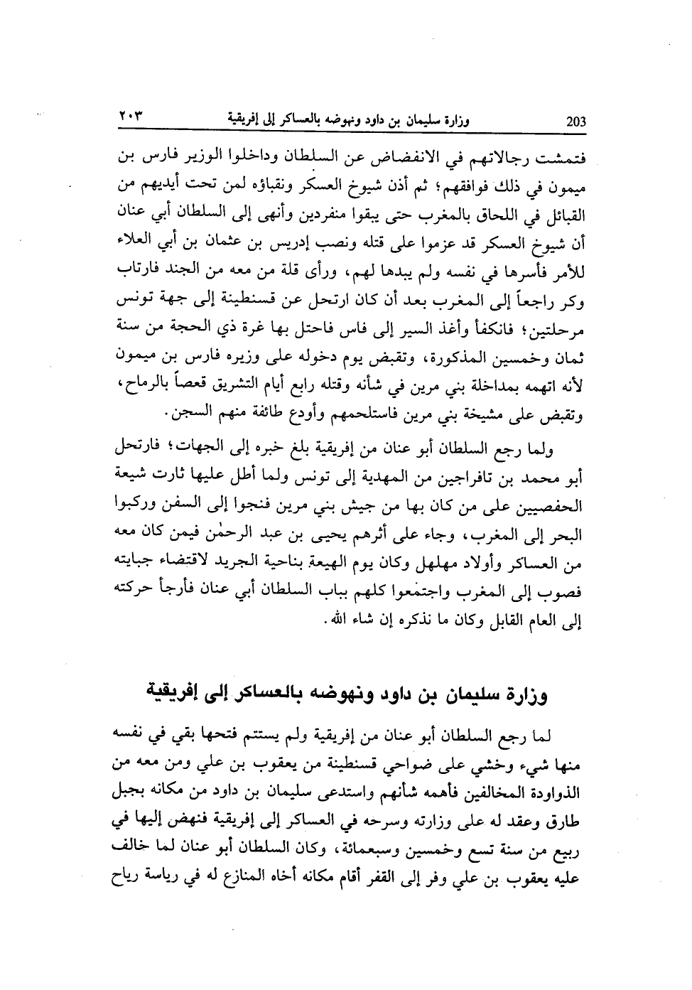 لما رَجَعَ السُّلْطَان أَبُو عنان من إفريقية وَلم يستتم فتحهَا بَقِي فِي نَفسه مِنْهَا شَيْء وخشي على ضواحي قسنطينة من يَعْقُوب بن عَليّ وَمن مَعَه من الذواودة الْمُخَالفين فأهمه شَأْنهمْ واستدعى سُلَيْمَان بن دَاوُد من مَكَانَهُ بجبل طَارق وَعقد لَهُ على وزارته وسرحه فِي العساكر إِلَى إفريقية فَنَهَضَ إِلَيْهَا فِي ربيع من سنة تسع وَخمسين وَسَبْعمائة وَكَانَ السُّلْطَان أَبُو عنان لما خَالف عَلَيْهِ يَعْقُوب بن عَليّ وفر إِلَى القفر أَقَامَ مَكَانَهُ أَخَاهُ المنازع لَهُ فِي رياسة ريَاح