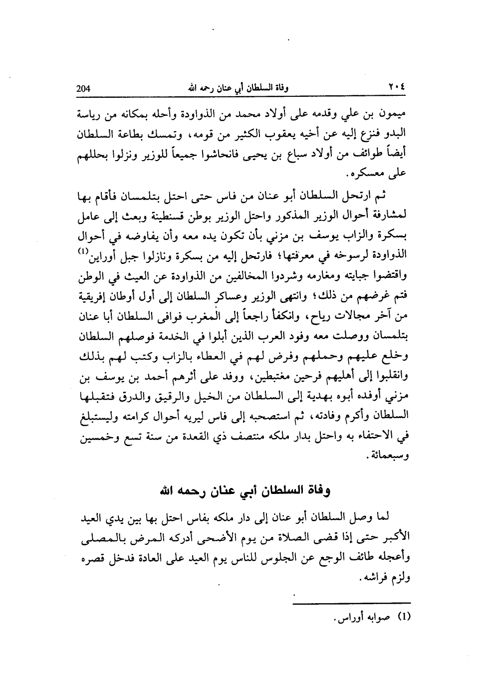 ثمَّ ارتحل السُّلْطَان ابو عنان من فاس حَتَّى احتل بتلمسان فَأَقَامَ بهَا لمشارفة أَحْوَال الْوَزير الْمَذْكُور واحتل الْوَزير بوطن قسنطينة وَبعث إِلَى عَامل بسكرة والزاب يُوسُف بن مزني بِأَن تكون يَده مَعَه وَأَن يفاوضه فِي أَحْوَال الذواودة لرسوخه فِي مَعْرفَتهَا فارتحل إِلَيْهِ من بسكرة ونازلوا جبل أوراين واقتضوا جبايته ومغارمه وشردوا الْمُخَالفين من الذواودة عَن العيث فِي الوطن فتم غرضهم من ذَلِك وانْتهى الْوَزير وعساكر السُّلْطَان إِلَى أول أوطان إفريقية من آخر مجالات ريَاح وانكفأ رَاجعا إِلَى الْمغرب فَوَافى السُّلْطَان أَبَا عنان بتلمسان ووصلت مَعَه وُفُود الْعَرَب الَّذين أبلوا فِي الْخدمَة فوصلهم السُّلْطَان وخلع عَلَيْهِم وَحَملهمْ وَفرض لَهُم فِي الْعَطاء بالزاب وَكتب لَهُم بذلك وانقلبوا إِلَى أَهْليهمْ فرحين مغتبطين ووفد على اثرهم أَحْمد بن يُوسُف بن مزني اوفده أَبوهُ بهدية إِلَى السُّلْطَان من الْخَيل وَالرَّقِيق والدرق فتقبلها السُّلْطَان وَأكْرم وفادته ثمَّ استصحبه إِلَى فاس ليريه أَحْوَال كرامته وليستبلغ فِي الاحتفاء بِهِ واحتل بدار ملكه منتصف ذِي الْقعدَة من سنة تسع وَخمسين وَسَبْعمائة