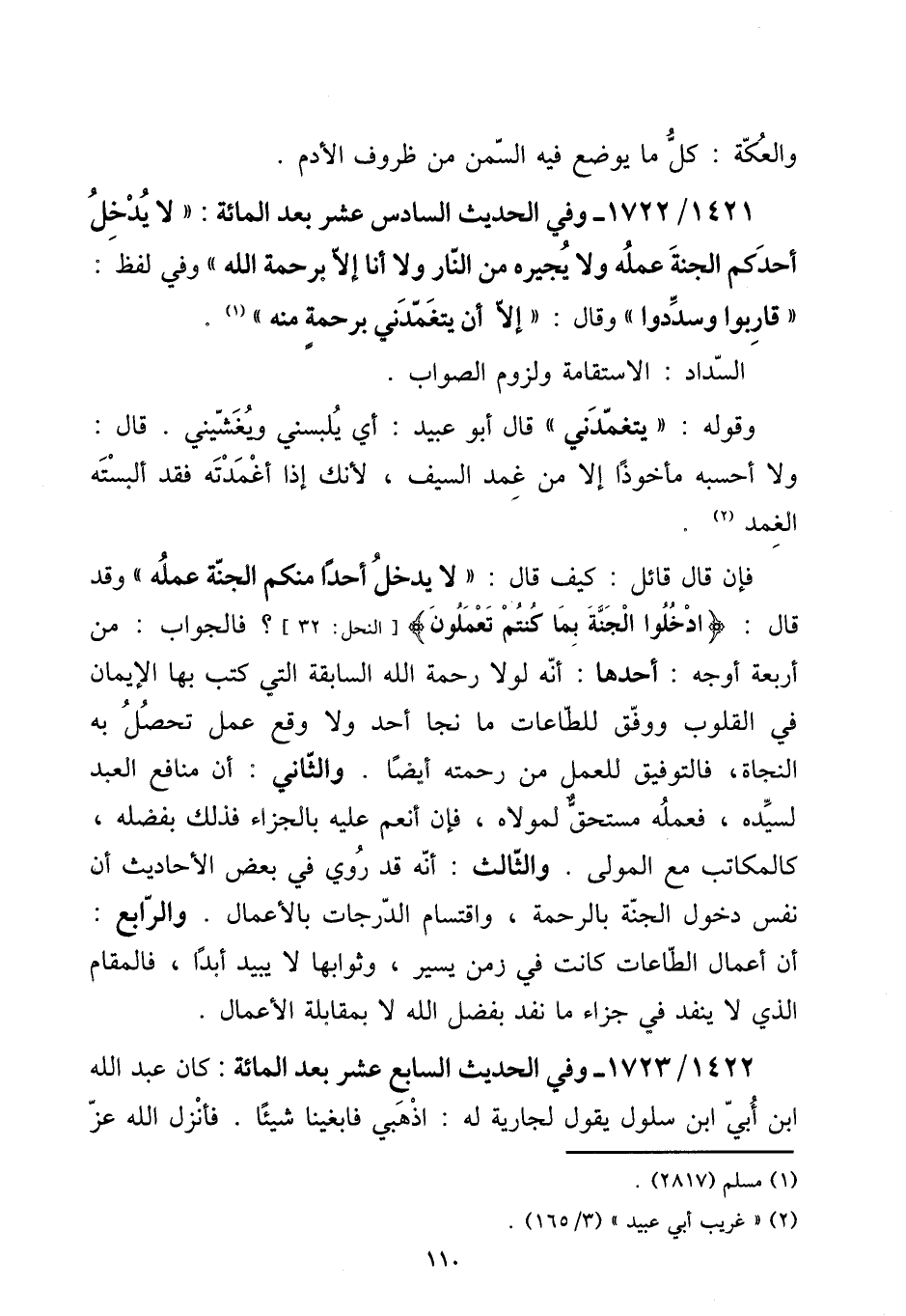 1421 - / 1722 - وَفِي الحَدِيث السَّادِس عشر بعد الْمِائَة: ((لَا يدْخل أحدكُم الْجنَّة عمله وَلَا يجيره من النَّار وَلَا أَنا إِلَّا برحمة الله)) وَفِي لفظ: ((قاربوا وسددوا)) وَقَالَ: ((إِلَّا أَن يتغمدني برحمة مِنْهُ)) .
