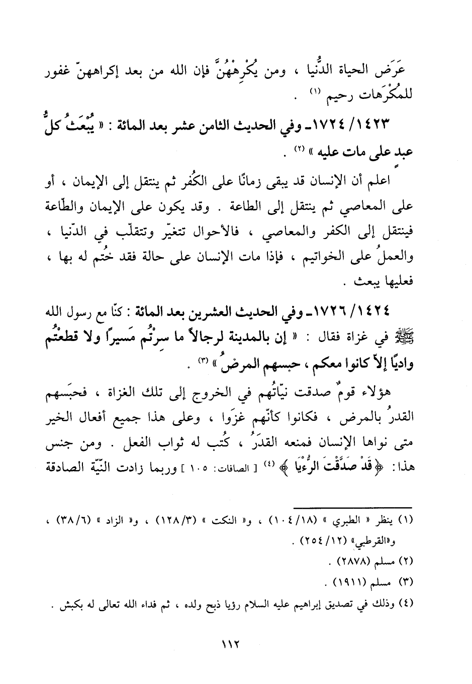 1423 - / 1724 - وَفِي الحَدِيث الثَّامِن عشر بعد الْمِائَة: ((يبْعَث كل عبد على مَاتَ عَلَيْهِ)) .