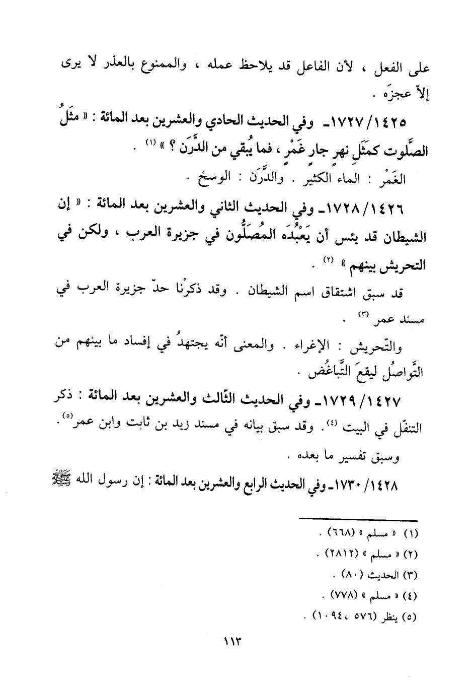 1426 - / 1728 - وَفِي الحَدِيث الثَّانِي وَالْعِشْرين بعد الْمِائَة: ((إِن الشَّيْطَان قد يئس أَن يعبده المصلون فِي جَزِيرَة الْعَرَب، وَلَكِن فِي التحريش بنيهم)) .