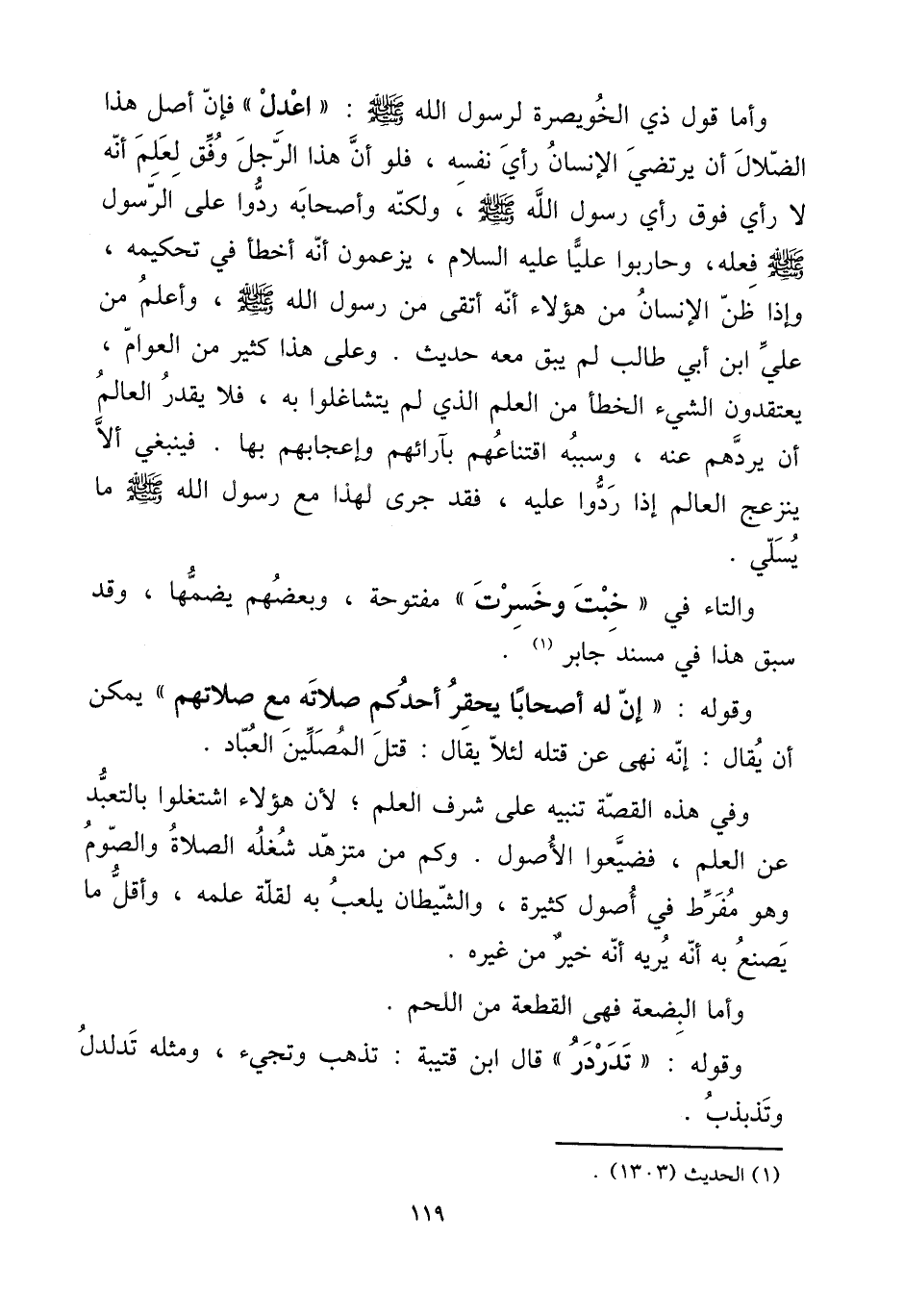 وَأما قَول ذِي الْخوَيْصِرَة لرَسُول الله صلى الله عَلَيْهِ وَسلم: ((اعْدِلْ)) فَإِن أصل هَذَا الضلال أَن يرتضي الْإِنْسَان رَأْي نَفسه، فَلَو أَن هَذَا الرجل وفْق لعلم أَنه لَا رَأْي فَوق رَأْي رَسُول الله صلى الله عَلَيْهِ وَسلم، وَلكنه وَأَصْحَابه ردوا على الرَّسُول صلى الله عَلَيْهِ وَسلم فعله، وحاربوا عليا عَلَيْهِ السَّلَام، يَزْعمُونَ أَنه أَخطَأ فِي تحكيمه، وَإِذا ظن الْإِنْسَان من هَؤُلَاءِ أَنه أتقى من رَسُول الله صلى الله عَلَيْهِ وَسلم، وَأعلم من عَليّ ابْن أبي طَالب لم يبْق مَعَه حَدِيث. وعَلى هَذَا كثير من الْعَوام، يَعْتَقِدُونَ الشَّيْء الْخَطَأ من الْعلم الَّذِي لم يتشاغلوا بِهِ، فَلَا يقدر الْعَالم أَن يردهم عَنهُ، وَسَببه اقتناعهم بآرائهم وإعجابهم بهَا. فَيَنْبَغِي أَلا ينزعج الْعَالم إِذا ردوا عَلَيْهِ، فقد جرى لهَذَا مَعَ رَسُول الله صلى الله عَلَيْهِ وَسلم مَا يسلي.