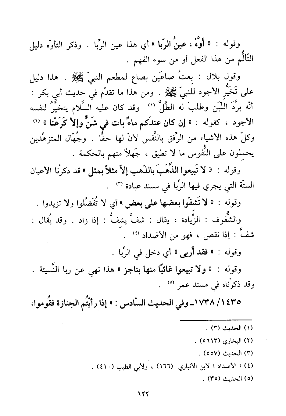 وَقَوله: ((لَا تَبِيعُوا الذَّهَب بِالذَّهَب إِلَّا مثلا بِمثل)) قد ذكرنَا الْأَعْيَان السِّتَّة الَّتِي يجْرِي فِيهَا الرِّبَا فِي مُسْند عبَادَة.