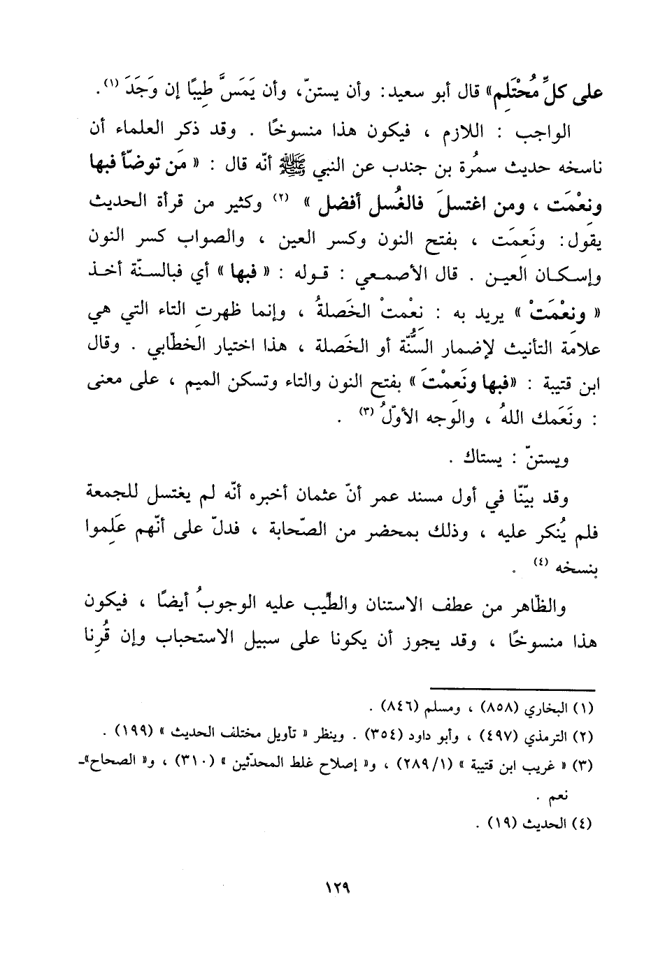 الْوَاجِب: اللَّازِم، فَيكون هَذَا مَنْسُوخا. وَقد ذكر الْعلمَاء أَن ناسخه حَدِيث سَمُرَة بن جُنْدُب عَن النَّبِي صلى الله عَلَيْهِ وَسلم أَنه قَالَ: ((من تَوَضَّأ فبها ونعمت، وَمن اغْتسل فالغسل أفضل)) وَكثير من قرأة الحَدِيث يَقُول: ونعمت، بِفَتْح النُّون وَكسر الْعين، وَالصَّوَاب كسر النُّون وَإِسْكَان الْعين. قَالَ الْأَصْمَعِي: قَوْله: ((فبها)) أَي فبالسنة أَخذ ((ونعمت)) يُرِيد بِهِ: نعمت الْخصْلَة، وَإِنَّمَا ظَهرت التَّاء الَّتِي هِيَ عَلامَة التَّأْنِيث لإضمار السّنة أَو الْخصْلَة، هَذَا اخْتِيَار الْخطابِيّ. وَقَالَ ابْن قُتَيْبَة: ((فبها ونعمت)) بِفَتْح النُّون وَالتَّاء وتسكن الْمِيم، على معنى: ونعمك الله، وَالْوَجْه الأول.