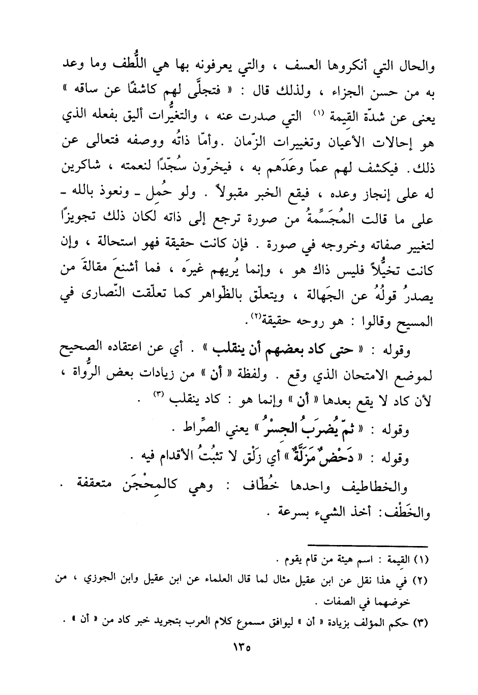وَالْحَال الَّتِي أنكروها العسف، وَالَّتِي يعرفونه بهَا هِيَ اللطف وَمَا وعد بِهِ من حسن الْجَزَاء، وَلذَلِك قَالَ: ((فتجلى لَهُم كاشفا عَن سَاقه)) يَعْنِي عَن شدَّة الْقيمَة الَّتِي صدرت عَنهُ، والتغيرات أليق بِفِعْلِهِ الَّذِي هُوَ إحالات الْأَعْيَان وتغييرات الزَّمَان. وَأما ذَاته وَوَصفه فتعالى عَن ذَلِك. فَيكْشف لَهُم عَمَّا وعدهم بِهِ، فَيَخِرُّونَ سجدا لنعمته، شاكرين لَهُ على إنجاز وعده، فَيَقَع الْخَبَر مَقْبُولًا. وَلَو حمل - ونعوذ بِاللَّه - على مَا قَالَت المجسمة من صُورَة ترجع إِلَى ذَاته لَكَانَ ذَلِك تجويزا لتغيير صِفَاته وَخُرُوجه فِي صُورَة. فَإِن كَانَت حَقِيقَة فَهُوَ اسْتِحَالَة، وَإِن كَانَت تخيلا فَلَيْسَ ذَاك هُوَ، وَإِنَّمَا يُرِيهم غَيره، فَمَا أشنع مقَالَة من يصدر قَوْله عَن الْجَهَالَة، وَيتَعَلَّق بالظواهر كَمَا تعلّقت النَّصَارَى فِي الْمَسِيح وَقَالُوا: هُوَ روحه حَقِيقَة.