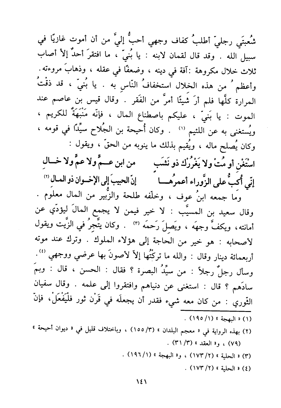 شُعْبَتَيْ رجْلي أطلب كفاف وَجْهي أحب إِلَى من أَن أَمُوت غازيا فِي سَبِيل الله. وَقد قَالَ لُقْمَان لِابْنِهِ: يَا بني، مَا افْتقر أحد إِلَّا أصَاب ثَلَاث خلال مَكْرُوهَة: آفَة فِي دينه، وضعفا فِي عقله، وَذَهَاب مروءته. وَأعظم من هَذِه الْخلال استخفاف النَّاس بِهِ. يَا بني، قد ذقت المرارة كلهَا فَلم أر شَيْئا أَمر من الْفقر. وَقَالَ قيس بن عَاصِم عِنْد الْمَوْت: يَا بني، عَلَيْكُم باصطناع المَال، فَإِنَّهُ منبهة للكريم، ويستغنى بِهِ عَن اللَّئِيم. وَكَانَ أحيحة بن الجلاح سيدا فِي قومه، وَكَانَ يصلح مَاله، وَيُقِيم بذلك مَا ينوبه من الْحق، وَيَقُول: