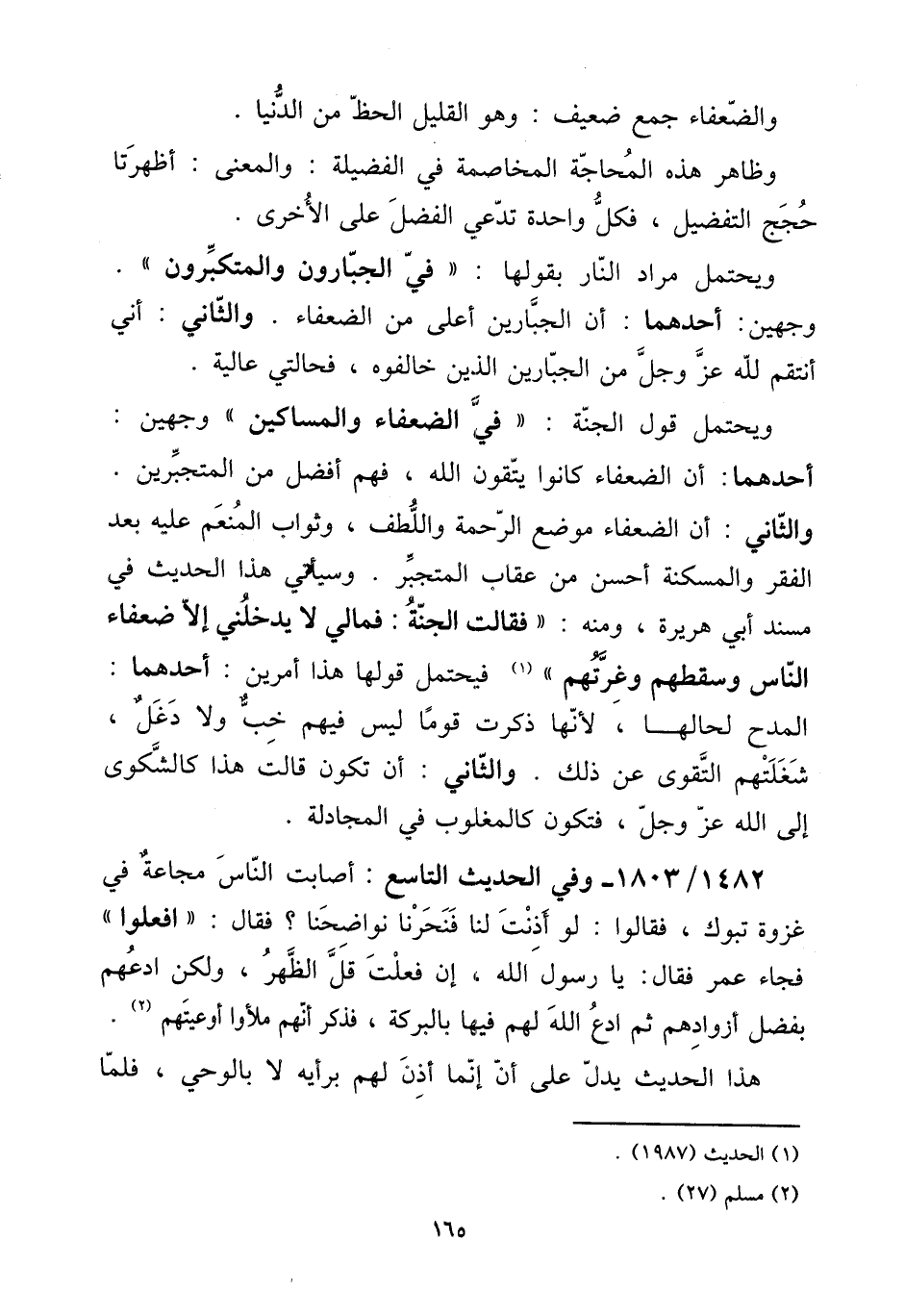 وَالثَّانِي: أَن الضُّعَفَاء مَوضِع الرَّحْمَة واللطف، وثواب الْمُنعم عَلَيْهِ بعد الْفقر والمسكنة أحسن من عِقَاب المتجبر. وَسَيَأْتِي هَذَا الحَدِيث فِي مُسْند أبي هُرَيْرَة، وَمِنْه: (فَقَالَت الْجنَّة: فَمَالِي لَا يدخلني إِلَّا ضعفاء النَّاس وَسَقَطهمْ وغرتهم)) فَيحْتَمل قَوْلهَا هَذَا أَمريْن: أَحدهمَا: الْمَدْح لحالها، لِأَنَّهَا ذكرت قوما لَيْسَ فيهم خب وَلَا دغل، شغلتهم التَّقْوَى عَن ذَلِك. وَالثَّانِي: أَن تكون قَالَت هَذَا كالشكوى إِلَى الله عز وَجل، فَتكون كالمغلوب فِي المجادلة.