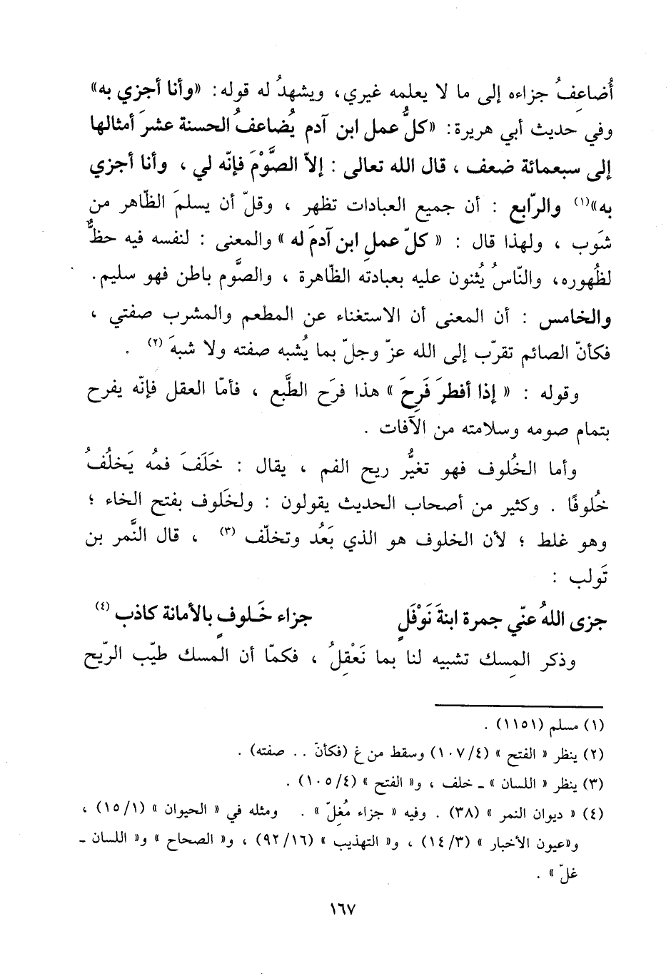 وَفِي حَدِيث أبي هُرَيْرَة: ((كل عمل ابْن آدم يُضَاعف الْحَسَنَة عشر أَمْثَالهَا إِلَى سَبْعمِائة ضعف، قَالَ الله تَعَالَى: إِلَّا الصَّوْم فَإِنَّهُ لي، وَأَنا أجزي بِهِ)) وَالرَّابِع: أَن جَمِيع الْعِبَادَات تظهر، وَقل أَن يسلم الظَّاهِر من شوب، وَلِهَذَا قَالَ: ((كل عمل ابْن آدم لَهُ)) وَالْمعْنَى: لنَفسِهِ فِيهِ حَظّ لظُهُوره، وَالنَّاس يثنون عَلَيْهِ بِعِبَادَتِهِ الظَّاهِرَة، وَالصَّوْم بَاطِن فَهُوَ سليم.