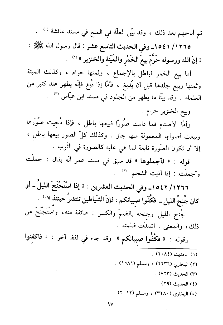 1265 - / 1541 - وَفِي الحَدِيث التَّاسِع عشر: قَالَ رَسُول الله صلى الله عَلَيْهِ وَسلم ((إِن الله وَرَسُوله حرم بيع الْخمر وَالْميتَة وَالْخِنْزِير)) .