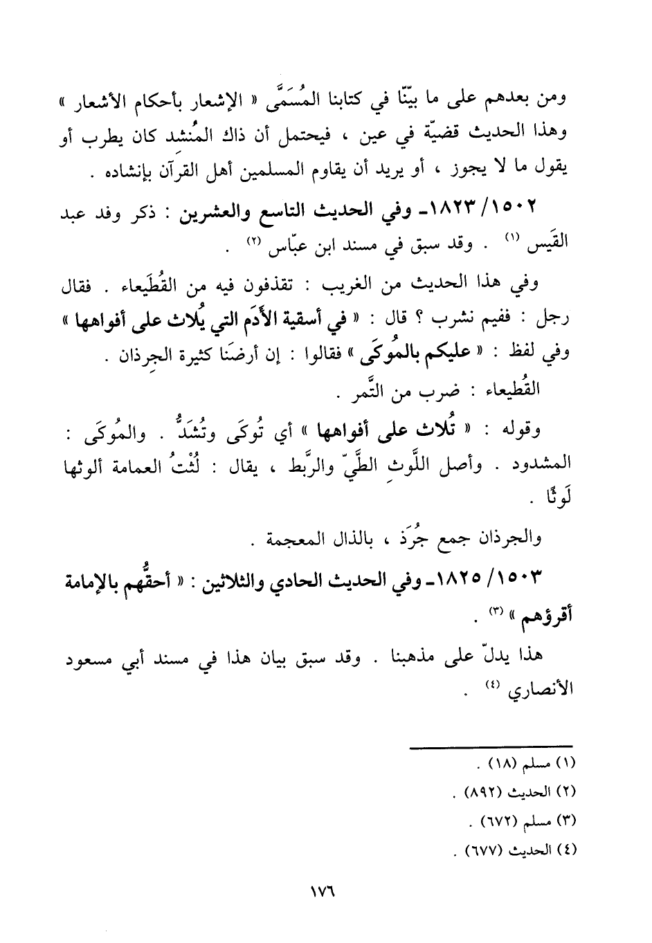 وَمن بعدهمْ على مَا بَينا فِي كتَابنَا الْمُسَمّى ((الْإِشْعَار بِأَحْكَام الْأَشْعَار)) وَهَذَا الحَدِيث قَضِيَّة فِي عين، فَيحْتَمل أَن ذَاك المنشد كَانَ يطرب أَو يَقُول مَا لَا يجوز، أَو يُرِيد أَن يُقَاوم الْمُسلمين أهل الْقُرْآن بإنشاده.