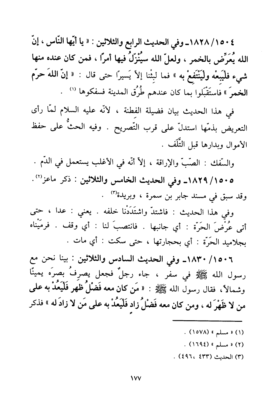 1504 - / 1828 - وَفِي الحَدِيث الرَّابِع وَالثَّلَاثِينَ: ((يَا أَيهَا النَّاس، إِن الله يعرض بِالْخمرِ، وَلَعَلَّ الله سينزل فِيهَا أمرا، فَمن كَانَ عِنْده مِنْهَا شَيْء فليبعه ولينتفع بِهِ)) فَمَا لبثنا إِلَّا يَسِيرا حَتَّى قَالَ: ((إِن الله حرم الْخمر)) فَاسْتَقْبلُوا بِمَا كَانَ عِنْدهم طرق الْمَدِينَة فسفكوها.