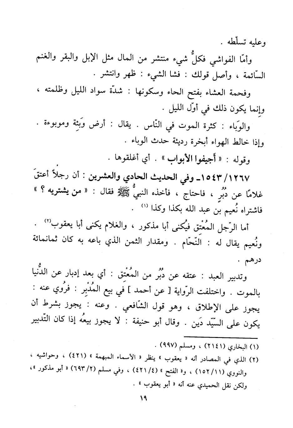 1267 - / 1543 - وَفِي الحَدِيث الْحَادِي وَالْعِشْرين: أَن رجلا أعتق غُلَاما عَن دبر، فَاحْتَاجَ، فَأَخذه النَّبِي صلى الله عَلَيْهِ وَسلم فَقَالَ: ((من يَشْتَرِيهِ؟)) فَاشْتَرَاهُ نعيم بن عبد الله بِكَذَا وَكَذَا.