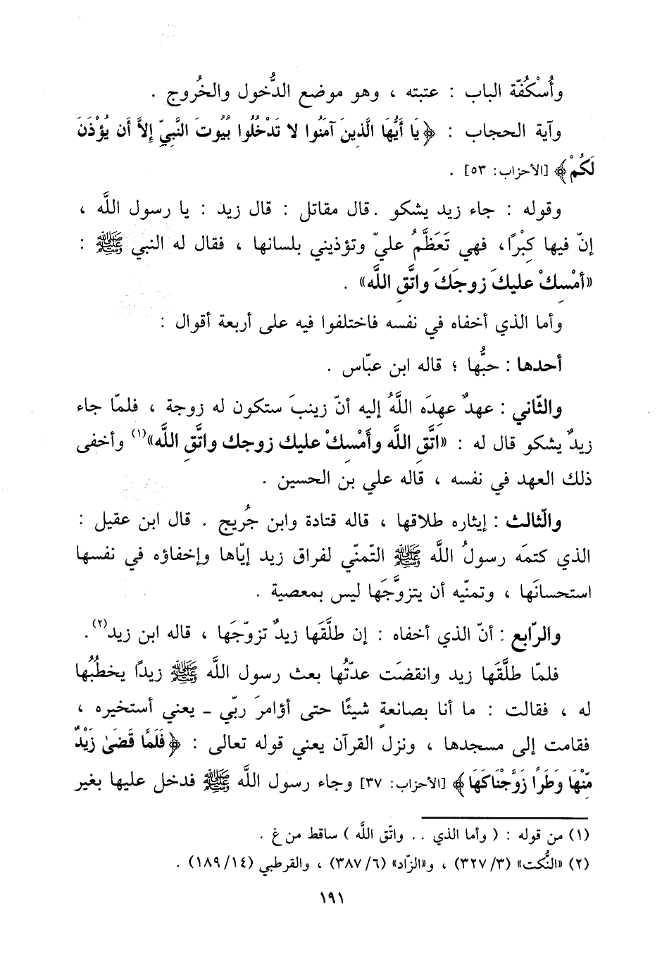وَالثَّالِث: إيثاره طَلاقهَا، قَالَه قَتَادَة وَابْن جريج. قَالَ ابْن عقيل: الَّذِي كتمه رَسُول الله صلى الله عَلَيْهِ وَسلم التَّمَنِّي لفراق زيد إِيَّاهَا وإخفاؤه فِي نَفسهَا استحسانها، وتمنيه أَن يَتَزَوَّجهَا لَيْسَ بِمَعْصِيَة.