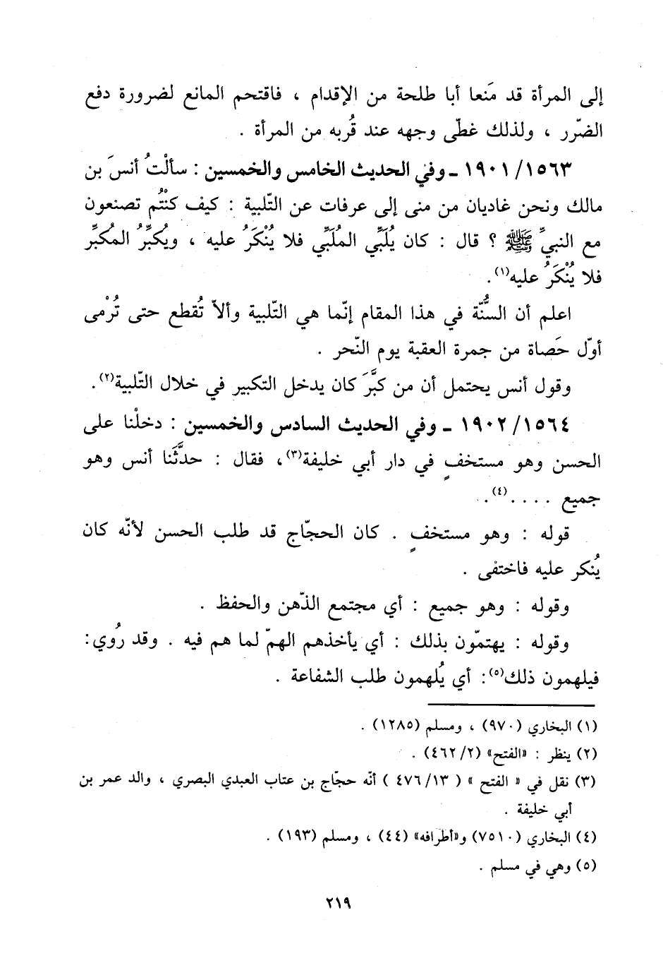 1563 - / 1901 - وَفِي الحَدِيث الْخَامِس وَالْخمسين: سَأَلت أنس بن مَالك وَنحن غاديان من منى إِلَى عَرَفَات عَن التَّلْبِيَة: كَيفَ كُنْتُم تَصْنَعُونَ مَعَ النَّبِي صلى الله عَلَيْهِ وَسلم؟ قَالَ: كَانَ يُلَبِّي الملبي فَلَا يُنكر عَلَيْهِ، وَيكبر المكبر فَلَا يُنكر عَلَيْهِ.