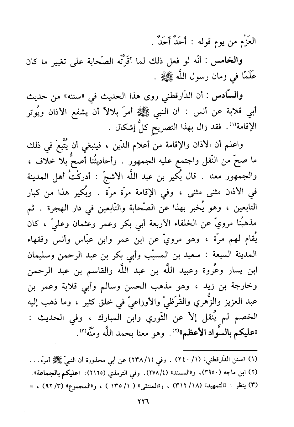 وَاعْلَم أَن الْأَذَان وَالْإِقَامَة من أَعْلَام الدّين، فَيَنْبَغِي أَن يتبع فِي ذَلِك مَا صَحَّ من النَّقْل وَاجْتمعَ عَلَيْهِ الْجُمْهُور. وأحاديثنا أصح بِلَا خلاف، وَالْجُمْهُور مَعنا. قَالَ بكير بن عبد الله الْأَشَج: أدْركْت أهل الْمَدِينَة فِي الْأَذَان مثنى مثنى، وَفِي الْإِقَامَة مرّة مرّة. وَبُكَيْر هَذَا من كبار التَّابِعين، وَهُوَ يخبر بِهَذَا عَن الصَّحَابَة وَالتَّابِعِينَ فِي دَار الْهِجْرَة. ثمَّ مَذْهَبنَا مَرْوِيّ عَن الْخُلَفَاء الْأَرْبَعَة أبي بكر وَعمر وَعُثْمَان وَعلي، كَانَ يُقَام لَهُم مرّة، وَهُوَ مَرْوِيّ عَن ابْن عمر وَابْن عَبَّاس وَأنس وفقهاء الْمَدِينَة السَّبْعَة: سعيد بن الْمسيب وَأبي بكر بن عبد الرَّحْمَن وَسليمَان ابْن يسَار وَعُرْوَة وَعبيد الله بن عبد الله وَالقَاسِم بن عبد الرَّحْمَن وخارجة بن زيد، وَهُوَ مَذْهَب الْحسن وَسَالم وَأبي قلَابَة وَعمر بن عبد الْعَزِيز وَالزهْرِيّ والقرظي وَالْأَوْزَاعِيّ فِي خلق كثير، وَمَا ذهب إِلَيْهِ الْخصم لم ينْقل إِلَّا عَن الثَّوْريّ وَابْن الْمُبَارك، وَفِي الحَدِيث: ((عَلَيْكُم بِالسَّوَادِ الْأَعْظَم)) . وَهُوَ مَعنا بِحَمْد الله وَمِنْه.