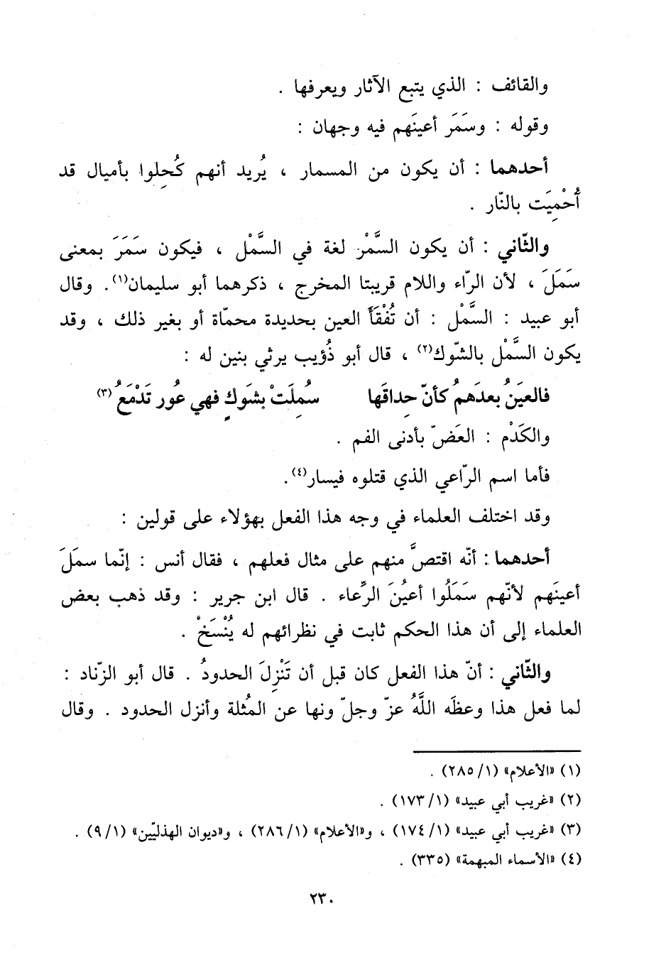 وَالثَّانِي: أَن يكون السمر لُغَة فِي السمل، فَيكون سمر بِمَعْنى سمل، لِأَن الرَّاء وَاللَّام قريبتا الْمخْرج، ذكرهمَا أَبُو سُلَيْمَان. وَقَالَ أَبُو عبيد: السمل: أَن تفقأ الْعين بحديدة محماة أَو بِغَيْر ذَلِك، وَقد يكون السمل بالشوك، قَالَ أَبُو ذُؤَيْب يرثي بَنِينَ لَهُ: