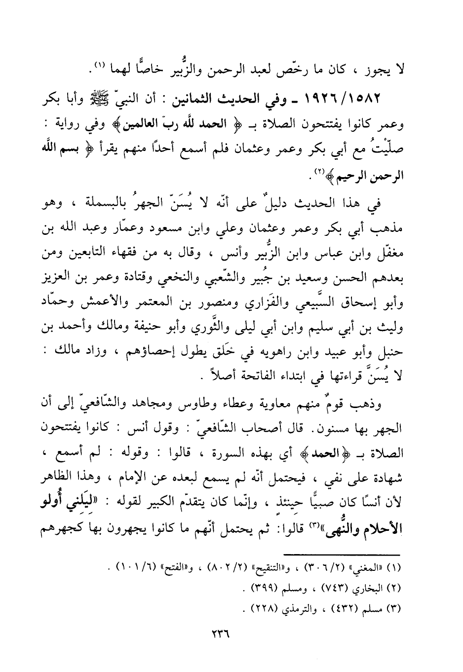 1582 - / 1926 - وَفِي الحَدِيث الثَّمَانِينَ: أَن النَّبِي صلى الله عَلَيْهِ وَسلم وَأَبا بكر وَعمر كَانُوا يفتتحون الصَّلَاة ب {الْحَمد لله رب الْعَالمين} وَفِي رِوَايَة: صليت مَعَ أبي بكر وَعمر وَعُثْمَان فَلم أسمع أحدا مِنْهُم يقْرَأ {بِسم الله الرَّحْمَن الرَّحِيم} .