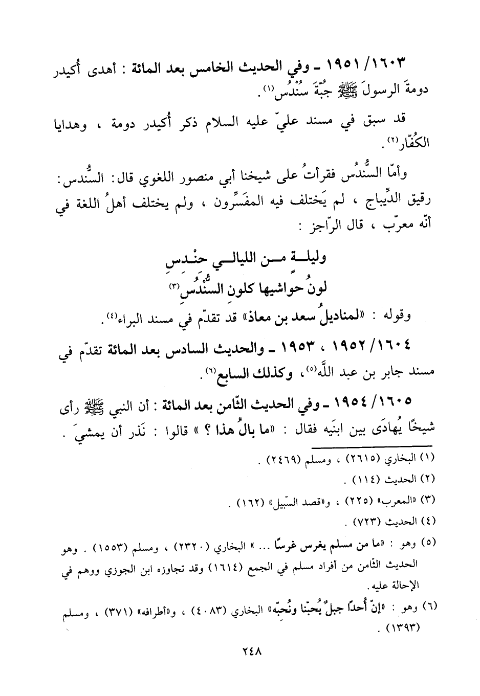 1603 - / 1951 - وَفِي الحَدِيث الْخَامِس بعد الْمِائَة: أهْدى أكيدر دومة الرَّسُول صلى الله عَلَيْهِ وَسلم جُبَّة سندس.