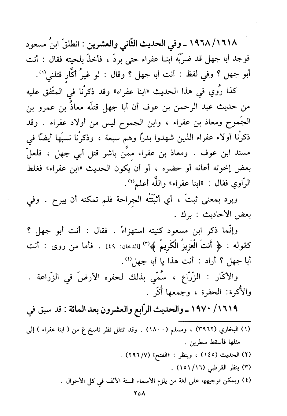 1618 - / 1968 - وَفِي الحَدِيث الثَّانِي وَالْعِشْرين: انْطلق ابْن مَسْعُود فَوجدَ أَبَا جهل قد ضربه ابْنا عفراء حَتَّى برد، فَأخذ بلحيته فَقَالَ: أَنْت أَبُو جهل؟ وَفِي لفظ: أَنْت أَبَا جهل؟ وَقَالَ: لَو غير أكار قتلني.