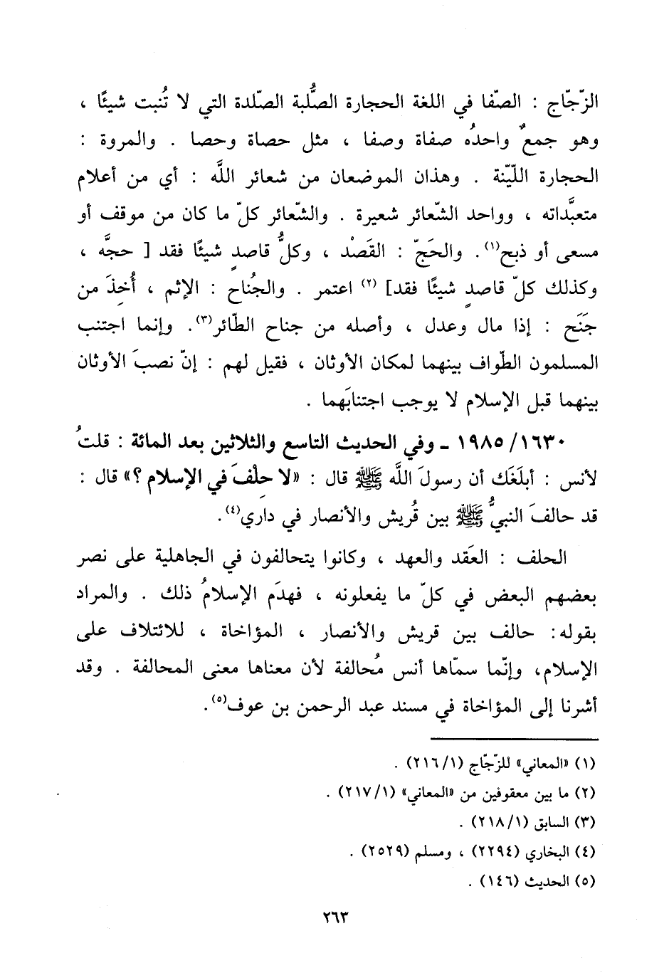 الزّجاج: الصَّفَا فِي اللُّغَة الْحِجَارَة الصلبة الصلدة الَّتِي لَا تنْبت شَيْئا، وَهُوَ جمع واحده صفاة وَصفا، مثل حَصَاة وحصا. والمروة: الْحِجَارَة اللينة. وَهَذَانِ الموضعان من شَعَائِر الله: أَي من أَعْلَام متعبداته، وَوَاحِد الشعائر شعيرَة. والشعائر كل مَا كَانَ من موقف أَو مسعى أَو ذبح. وَالْحج: الْقَصْد، وكل قَاصد شَيْئا فقد [حجه، وَكَذَلِكَ كل قَاصد شَيْئا فقد] اعْتَمر. والجناح: الْإِثْم، أَخذ من جنح: إِذا مَال وَعدل، وَأَصله من جنَاح الطَّائِر. وَإِنَّمَا اجْتنب الْمُسلمُونَ الطّواف بَينهمَا لمَكَان الْأَوْثَان، فَقيل لَهُم: إِن نصب الْأَوْثَان بَينهمَا قبل الْإِسْلَام لَا يُوجب اجتنابهما.