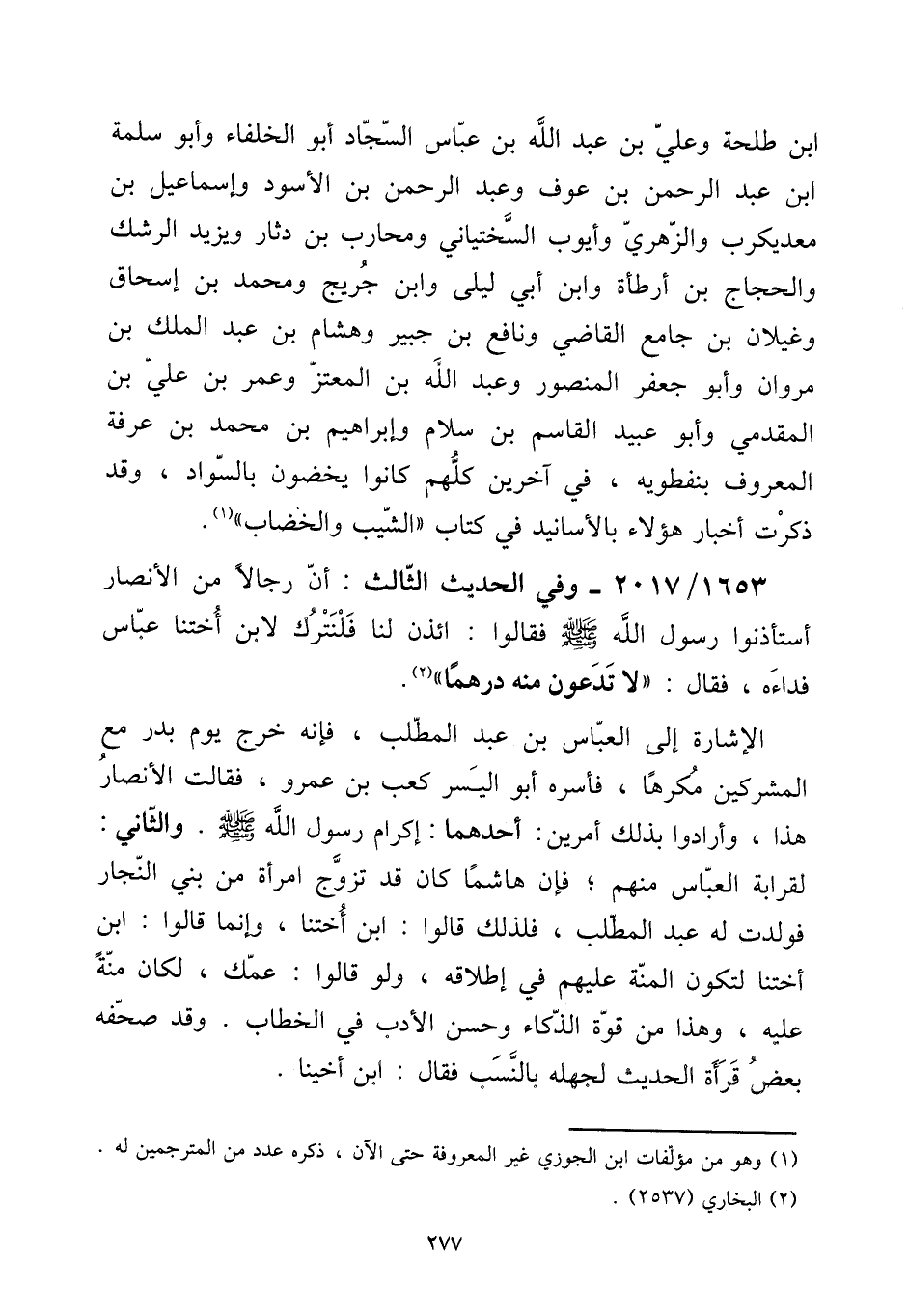 1653 - / 2017 - وَفِي الحَدِيث الثَّالِث: أَن رجَالًا من الْأَنْصَار اسْتَأْذنُوا رَسُول الله صلى الله عَلَيْهِ وَسلم فَقَالُوا: ائْذَنْ لنا فلنترك لِابْنِ أُخْتنَا عَبَّاس فداءه، فَقَالَ: ((لَا تدعون مِنْهُ درهما)) .