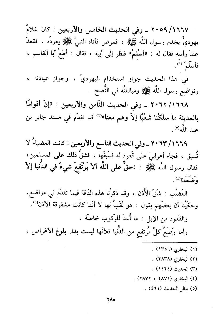1667 - / 2059 - وَفِي الحَدِيث الْخَامِس وَالْأَرْبَعِينَ: كَانَ غُلَام يَهُودِيّ يخْدم رَسُول الله صلى الله عَلَيْهِ وَسلم، فَمَرض فَأَتَاهُ النَّبِي صلى الله عَلَيْهِ وَسلم يعودهُ، فَقعدَ عِنْد رَأسه فَقَالَ لَهُ: ((أسلم)) فَنظر إِلَى أَبِيه، فَقَالَ: أطع أَبَا الْقَاسِم، فَأسلم.