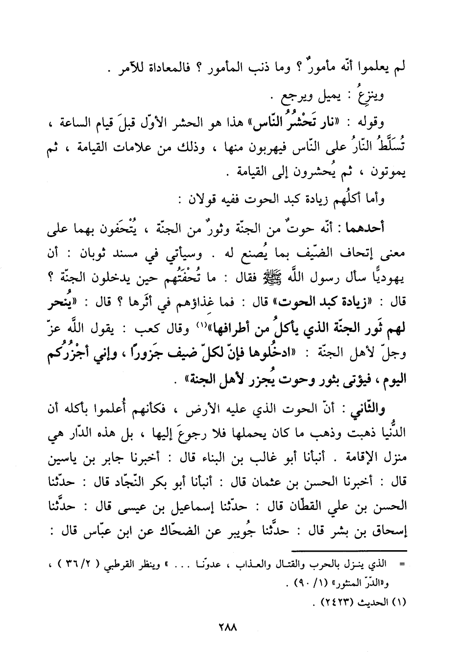 وَأما أكلهم زِيَادَة كبد الْحُوت فَفِيهِ قَولَانِ: أَحدهمَا: أَنه حوت من الْجنَّة وثور من الْجنَّة، يتحفون بهما على معنى إتحاف الضَّيْف بِمَا يصنع لَهُ. وَسَيَأْتِي من مُسْند ثَوْبَان: أَن يَهُودِيّا سَأَلَ رَسُول الله صلى الله عَلَيْهِ وَسلم فَقَالَ: مَا تحفتهم حِين يدْخلُونَ الْجنَّة؟ قَالَ: ((زِيَادَة كبد الْحُوت)) قَالَ: فَمَا غذاؤهم فِي أَثَرهَا؟ قَالَ: ((ينْحَر لَهُم ثَوْر الْجنَّة الَّذِي يَأْكُل من أطرافها)) وَقَالَ كَعْب: يَقُول الله عز وَجل لأهل الْجنَّة: ((ادخلوها فَإِن لكل ضيف جزورا، وَإِنِّي أجزركم الْيَوْم، فَيُؤتى بثور وحوت يجزر لأهل الْجنَّة)) .