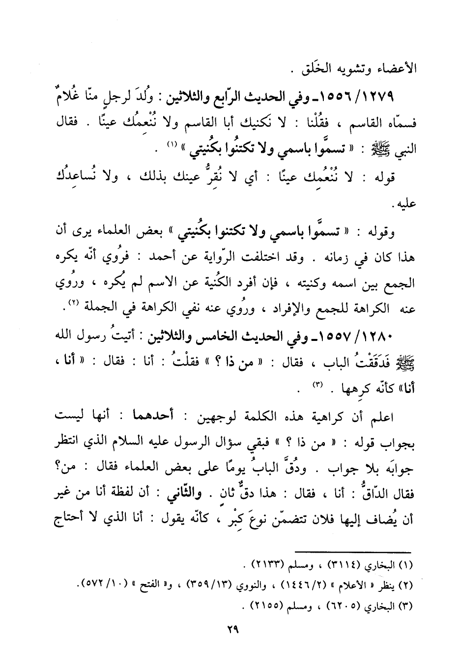 1279 - / 1556 - وَفِي الحَدِيث الرَّابِع وَالثَّلَاثِينَ: ولد لرجل منا غُلَام فَسَماهُ الْقَاسِم، فَقُلْنَا: لَا نكنيك أَبَا الْقَاسِم وَلَا ننعمك عينا. فَقَالَ النَّبِي صلى الله عَلَيْهِ وَسلم: ((تسموا باسمي وَلَا تكتنوا بكنيتي)) .