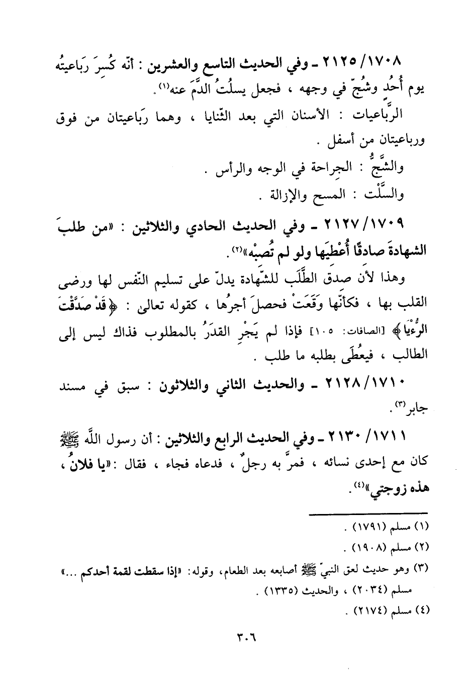 1708 - / 2125 - وَفِي الحَدِيث التَّاسِع وَالْعِشْرين: أَنه كسر رباعيته يَوْم أحد وشج فِي وَجهه، فَجعل يَسْلت الدَّم عَنهُ.