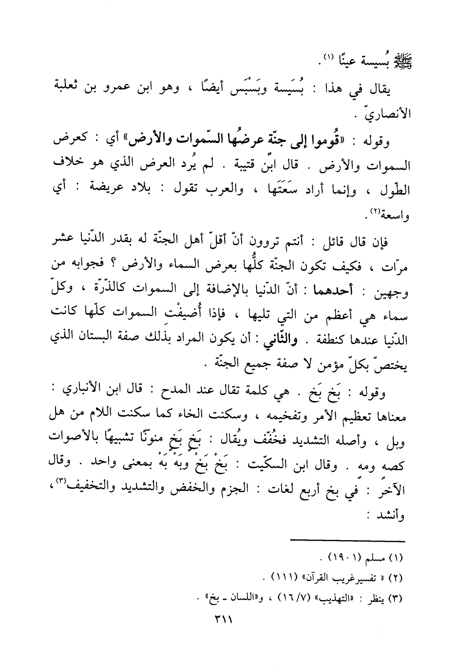 وَقَوله: ((قومُوا إِلَى جنَّة عرضهَا السَّمَوَات وَالْأَرْض)) أَي: كعرض السَّمَوَات وَالْأَرْض. قَالَ ابْن قُتَيْبَة. لم يرد الْعرض الَّذِي هُوَ خلاف الطول، وَإِنَّمَا أَرَادَ سعتها، وَالْعرب تَقول: بِلَاد عريضة: أَي وَاسِعَة.